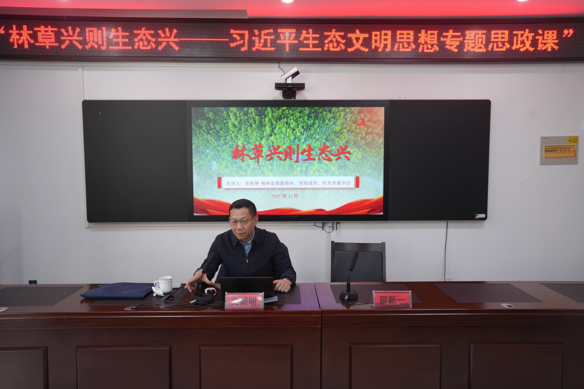 2025年11月26日下午,省林业局副局长、党组成员、机关党委书记史新明走进中北学院崇文楼111会议室,以“林草兴则生态兴”为题,为一百多名师生带来了一场内容丰富、思想深刻的生态文明思政课。讲座由中北学院党委副书记邵新一主持,全场座无虚席,气氛热烈。