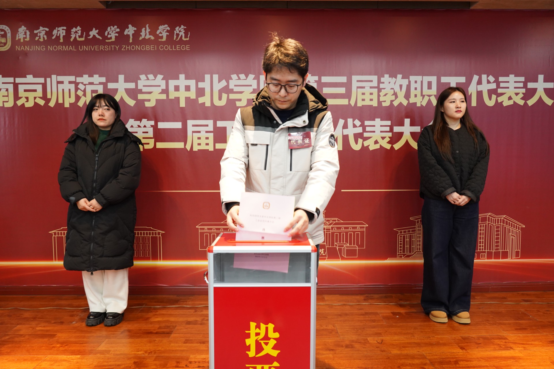 10时整,大会在庄严的国歌声中开幕。南京师范大学工会主席、教代会执委会常务副主任曹天安,丹阳市人大常委会副主任、市总工会主席林丹如亲临指导。学院院长戴传超、党委书记周燕及大会主席团成员出席,正式代表、列席代表、特邀代表参加会议。开幕式暨第一阶段会议由党委副书记邵新一主持。