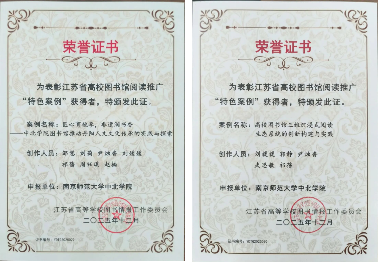 ky.com图书馆申报的《匠心育桃李,非遗润书香——中北学院图书馆推动丹阳人文文化传承的实践与探索》与《高校图书馆三维沉浸式阅读生态系统的创新构建与实践》两项案例双双获评江苏省高校图书馆阅读推广“特色案例”,此次获评彰显了学院在高校阅读推广领域的创新实践与突出成效。