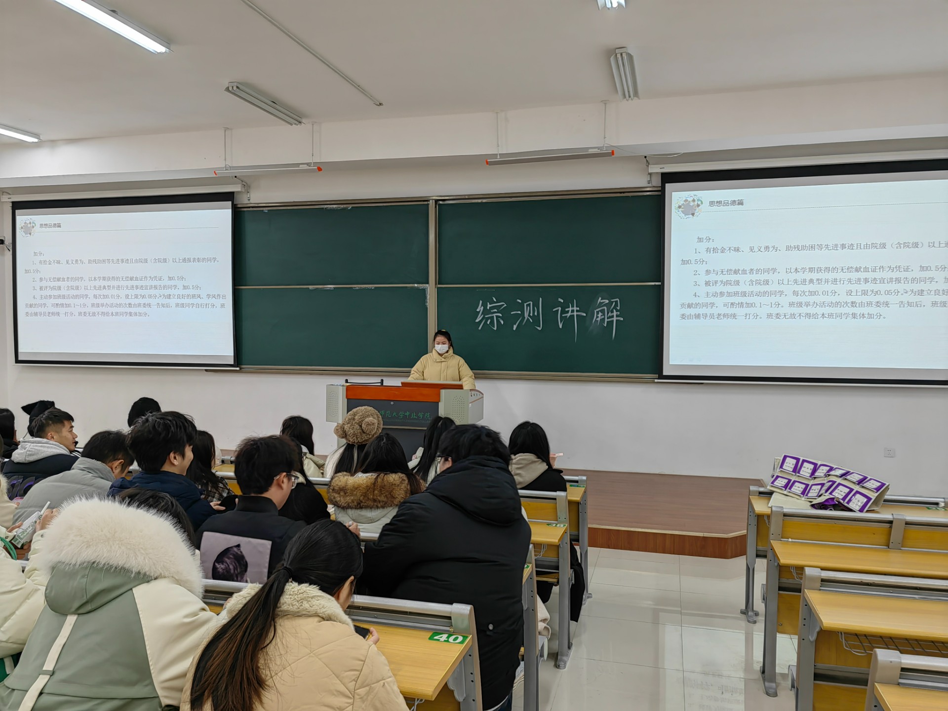 随后,各班班长为同学们详细解读了我院学生综合素质测评实施细则的具体内容,从思想品德测评、专业学习测评、体育素质测评和能力发展测评四部分着手,详细解读了每项内容与注意事项。随后,各班就综测附件与证明材料的提交进行了规范性提醒。