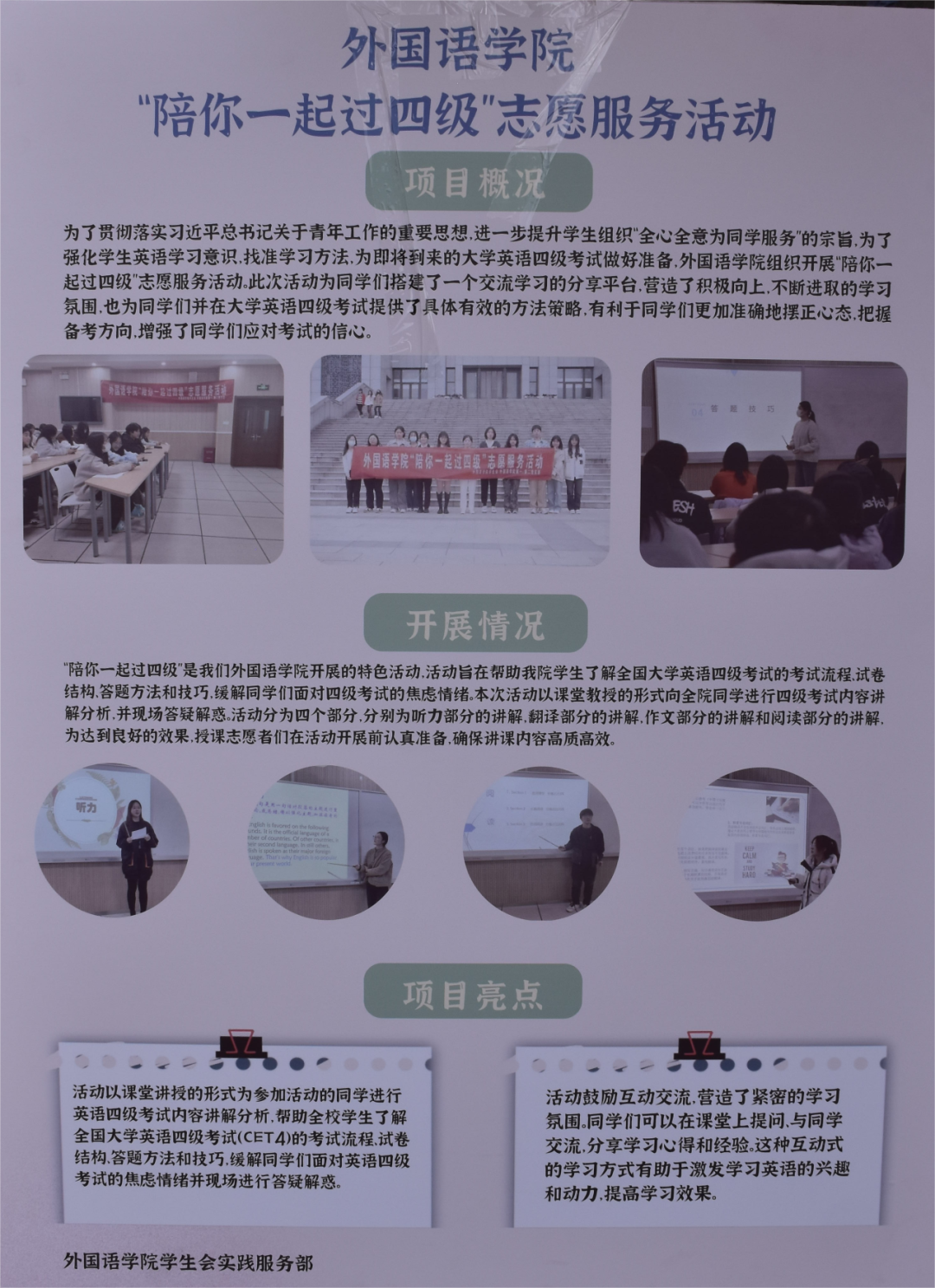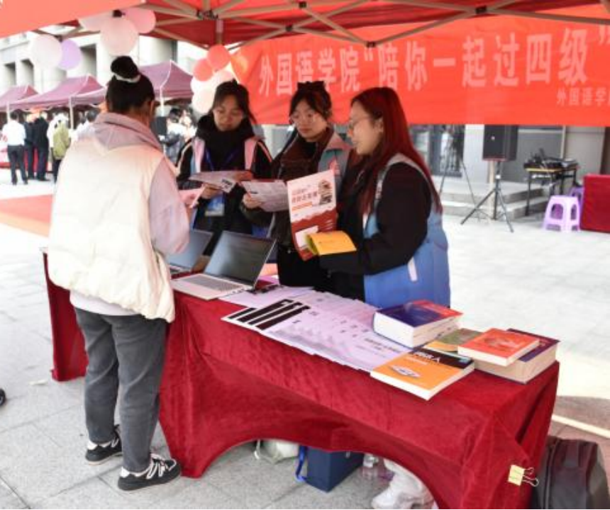 为弘扬“奉献、友爱、互助、进步”的志愿服务精神,展示我院师生志愿服务风采,鼓励青年学子积极投身志愿服务。2024年3月7日14:00,外国语学院于起凤楼广场参于校首届志愿者文化展示活动。此次活动我院特展示了“陪你一起过四级”特色精品志愿服务活动,外国语学院“陪你一起过四级”志愿服务活动旨在让同学们熟悉四级考试的内容与题型,为学生提供相应解题技巧,提高学生们四级考试的过级率和优秀率。