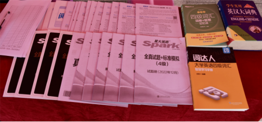 活动展示现场,外国语学院学工办主任刘亚翠老师和辅导员王文山老师与志愿者们一起布置展台。活动展示期间,外国语学院学生会实践服务部邀请前期志愿服务活动授课人员为同学们现场展示“陪你一起过四级”志愿服务的内容,并将四级相关题型的讲解PPT进行现场播放。学院志愿服务优秀成果展吸引了众多学生驻足参观,现场同学积极咨询并填写下一期“陪你一起过四级”活动报名表。此外,我院还精心准备了四级备考资料书《星火英语》《词达人》赠与学生。