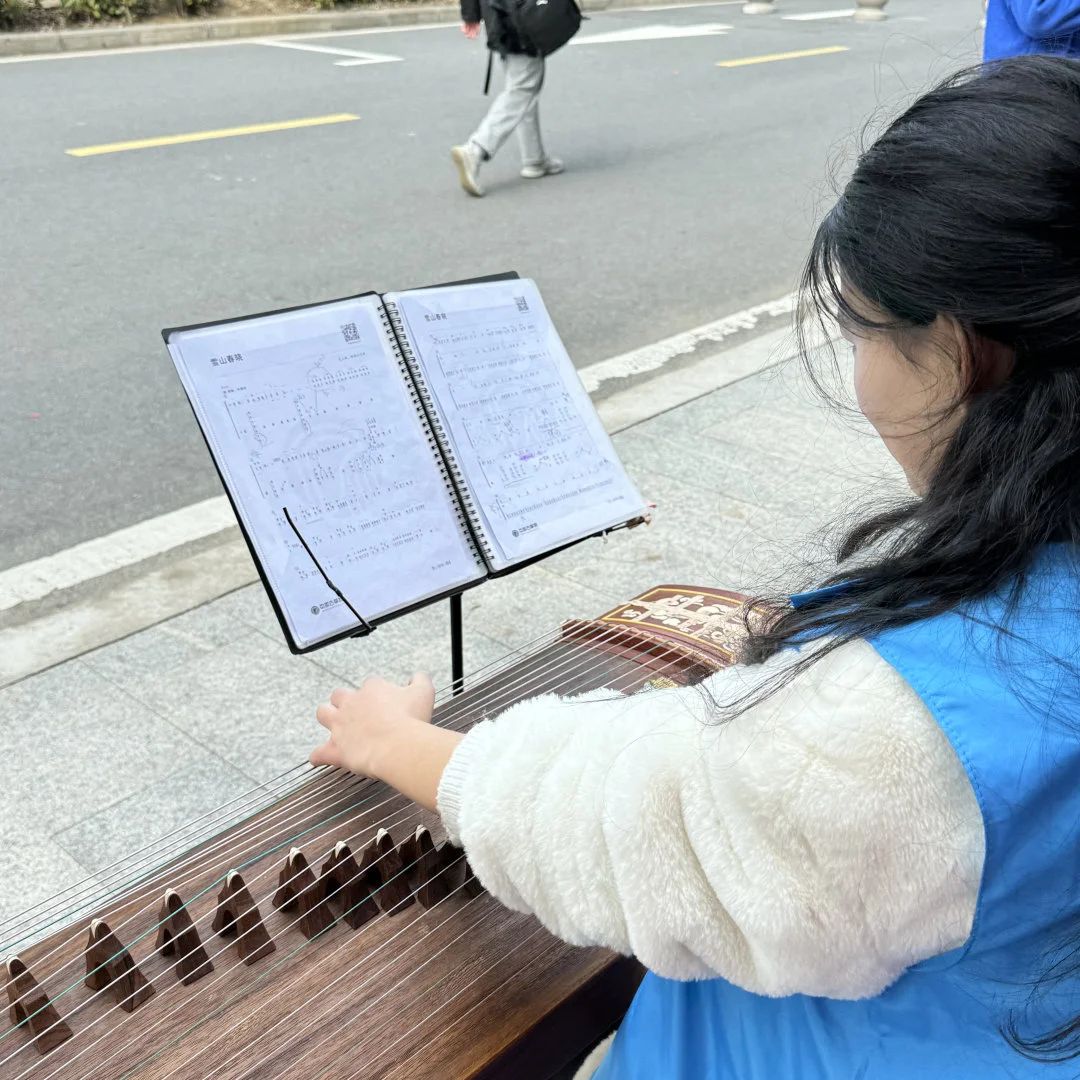 当然,琵琶独奏也是一场精彩绝伦的音乐盛宴。为了增加活动的互动性和趣味性,志愿者们对同学们进行了专业的指导,这让许多同学对琵琶产生了兴趣。最后古筝演奏活动,以其清朗的音色和独特的魅力再次吸引了同学们的目光。纤纤玉手,拨动琴弦;幽幽清风,扬起发丝。古筝音声声慢,漫于同学们心间,古筝音声声畅,耳畔轻同学们回荡。志愿者们端坐在古筝前,静的似乎与校园景色融为一体,顷刻间,他们在同学们眼中变得格外耀眼。