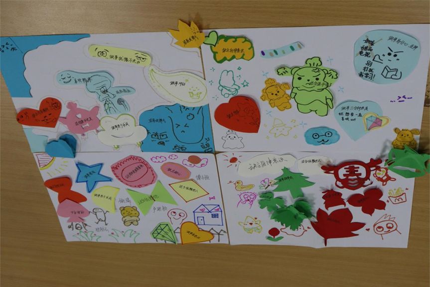 环节三,“完美拼图”。主持人将现场人员随机分组,每组3-5人。每组成员从纸片堆中随机抽取10张写有缺点的纸片,然后利用这些纸片、剪刀、双面胶、画笔等工具在白纸上拼成一幅画。此时的教室欢愉的氛围达到顶峰。
