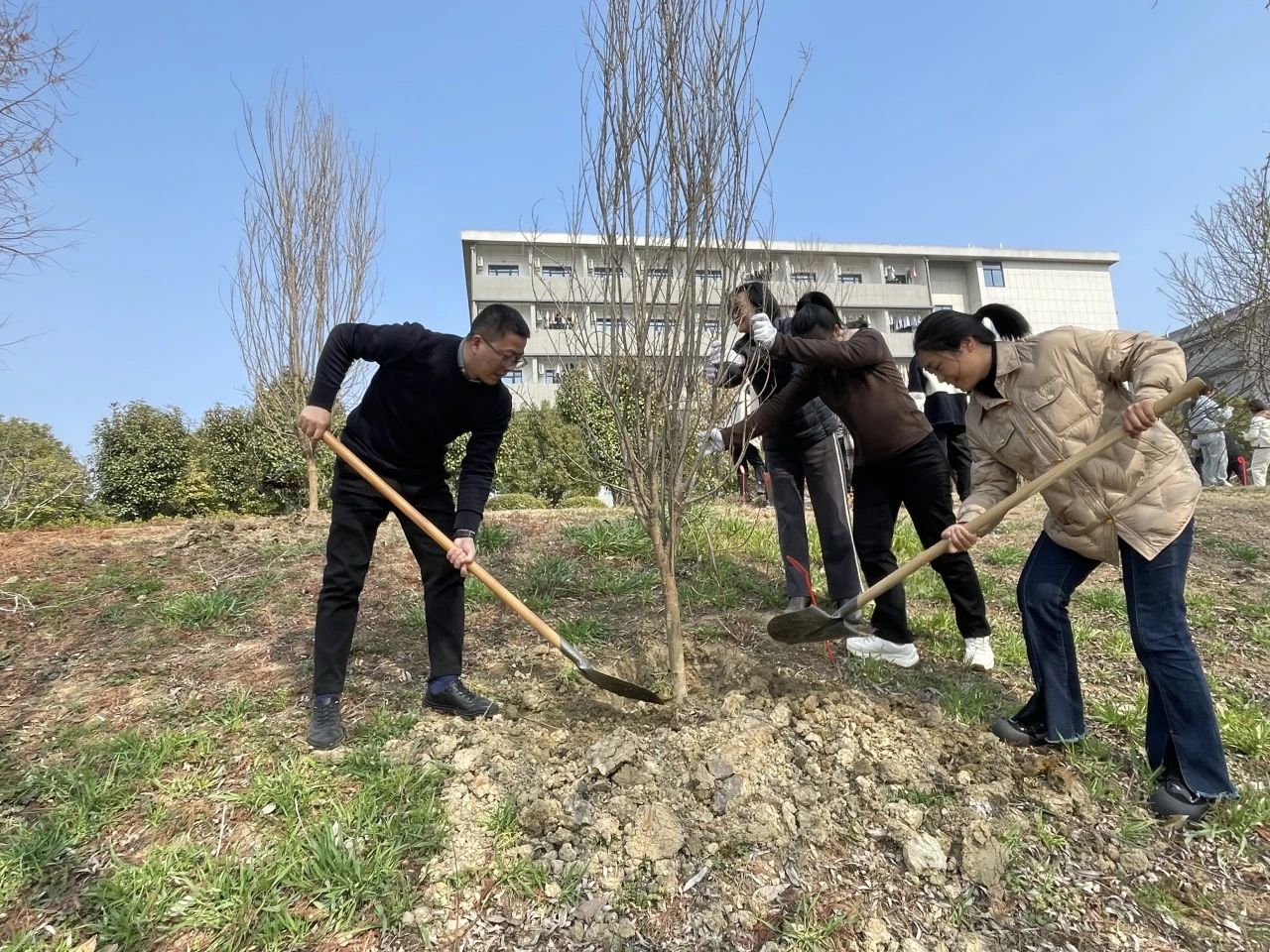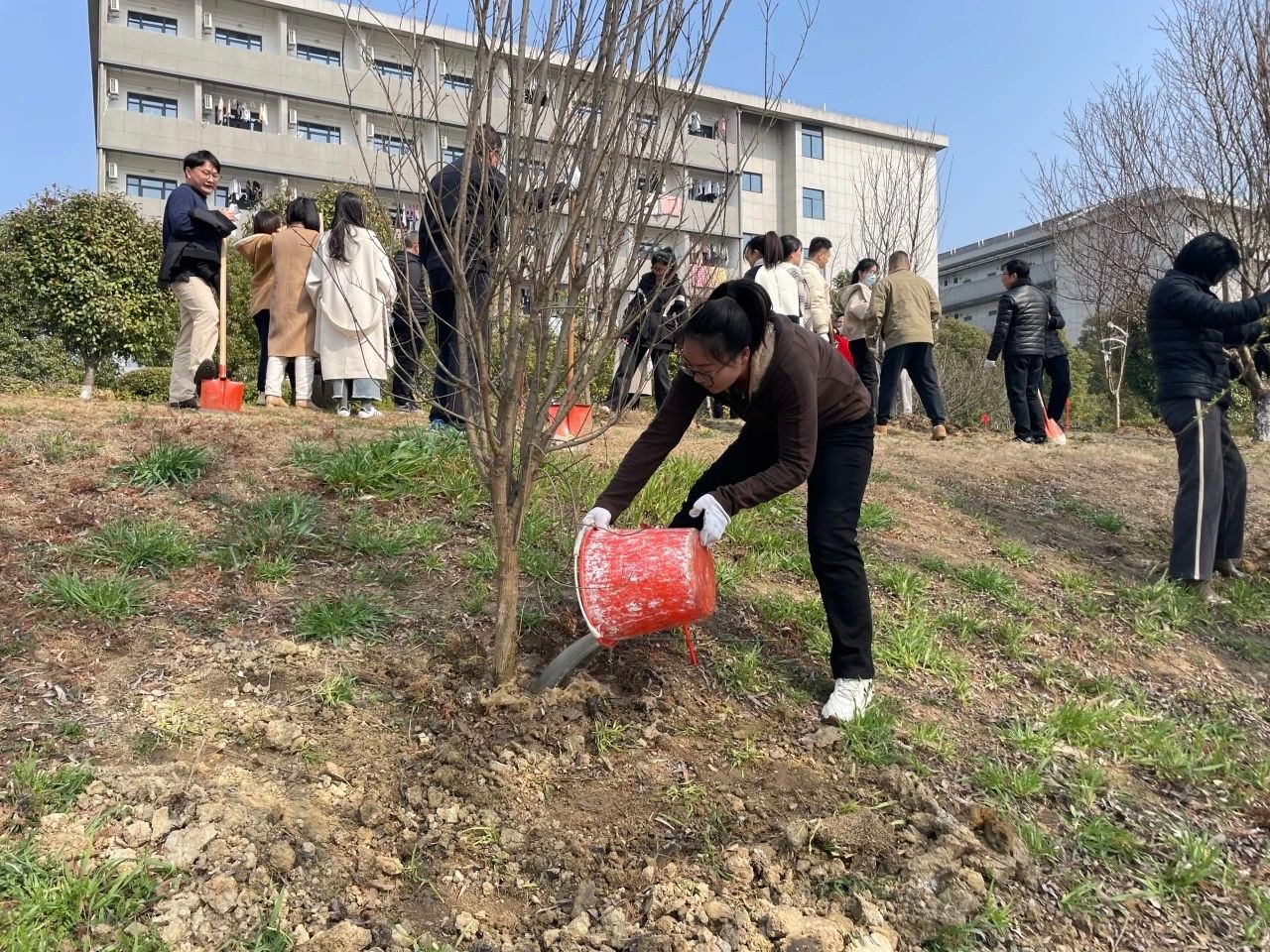植树现场,老师们分工明确,配合默契。有的挥锹铲土,有的扶树填坑,有的培土浇水,每一个环节都进行得有条不紊。虽然阳光炽热,但老师们的热情丝毫不减,大家干劲十足,脸上洋溢着劳动的喜悦。