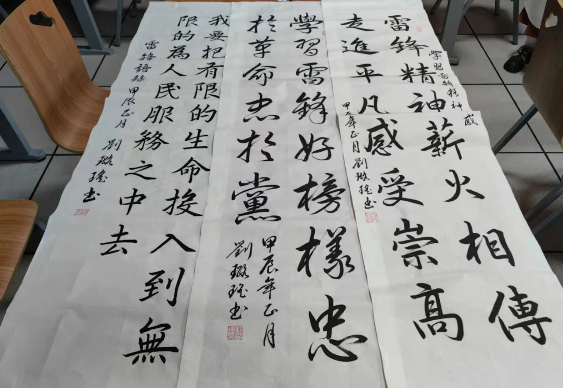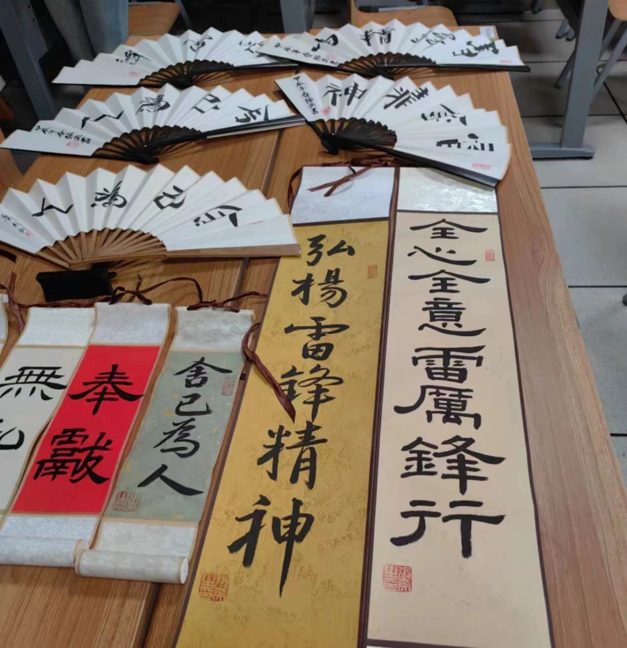 在书法创作现场,同学们凝神静气,一笔一划认真书写了“弘扬雷锋精神”、“无私奉献”等内容的作品,有的同学还以“学习雷锋”为素材进行创作。现场热情高涨,气氛浓厚,同学们通过书法创作,加深了对雷锋精神的理解和认识。