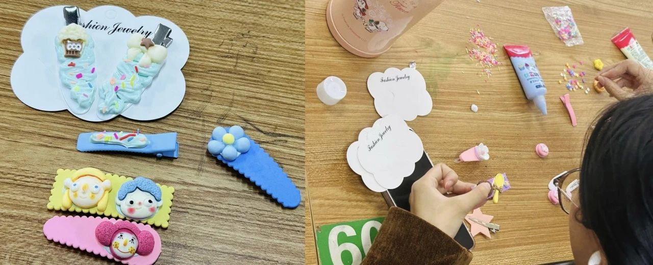 同学们巧妙地运用了奶油胶、鸭嘴夹等材料,并结合各种别致的装饰品,精心创作出了一款款别具一格、充满创意的发夹作品。看着自己的创意和劳动成果,同学们的脸上洋溢着满足和自豪的笑容。