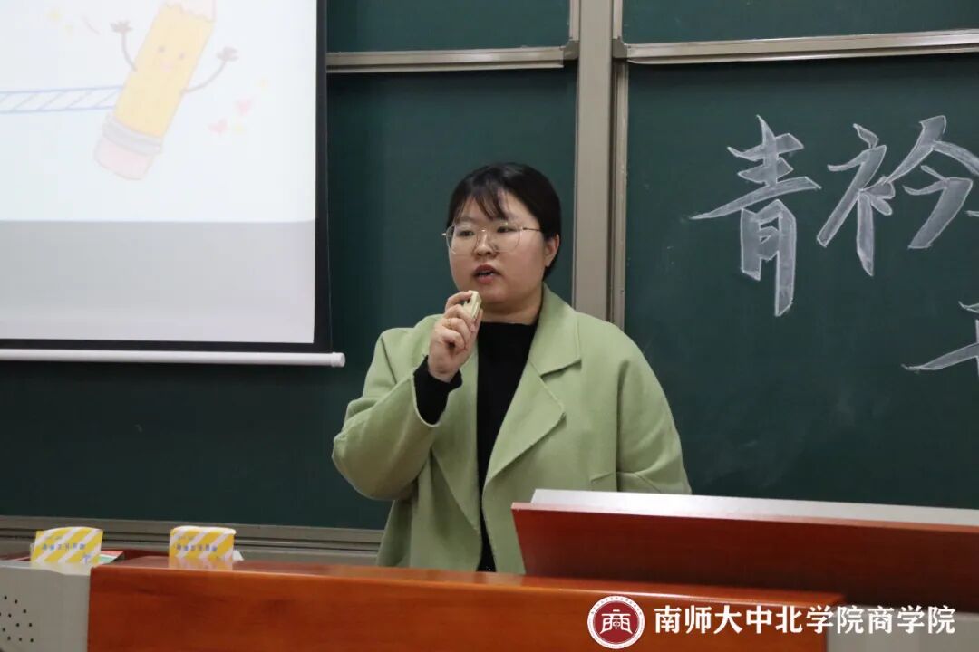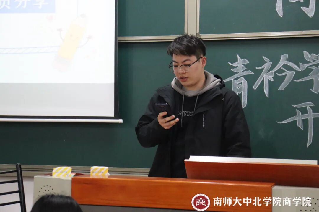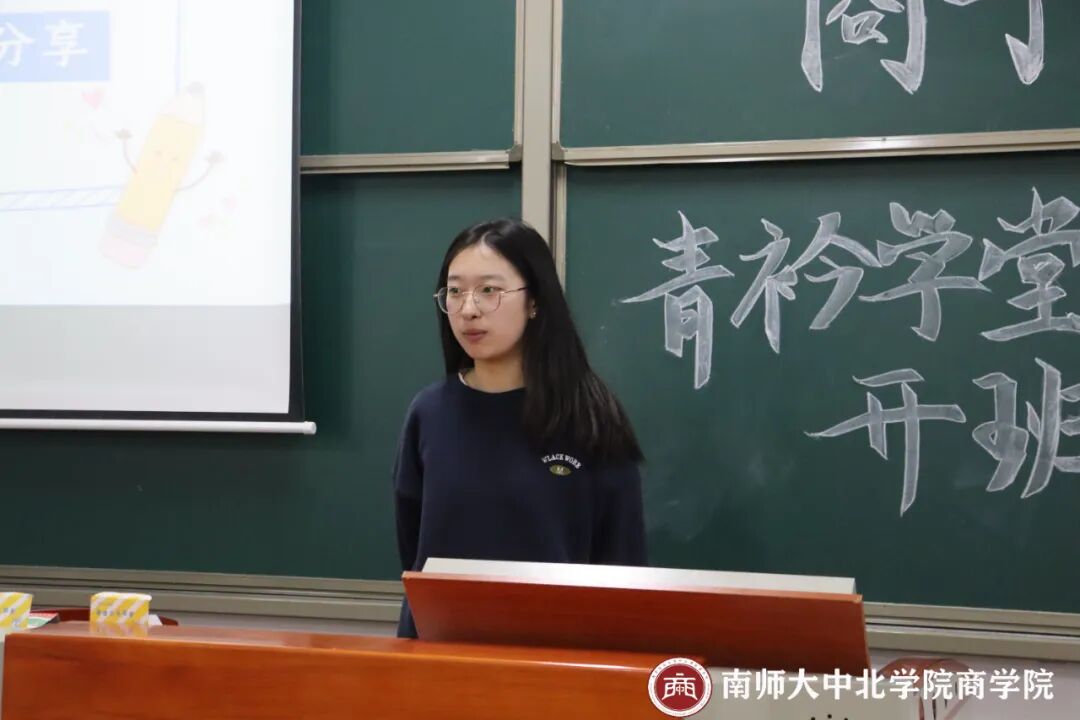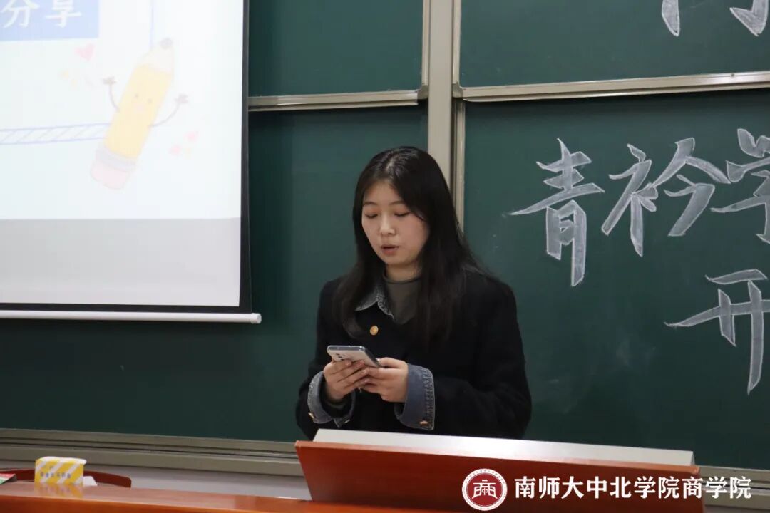 活动伊始,王青青同学简介了“青衿学堂”在我院的发展历程:青衿学堂是商学院组织的一项学业帮扶活动。于2020年9月成立,截至2024上半年,已成功举行七期青衿学堂活动。