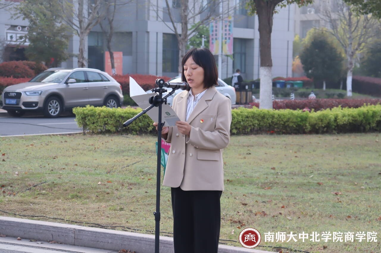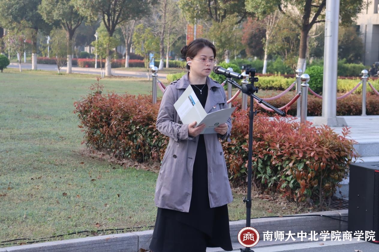 商学院党总支书记邹慧老师作国旗下讲话。她深情地缅怀了那些为民族、为国家英勇牺牲的革命先烈们,表达了最崇高的敬意和最深切的怀念!邹老师围绕缅怀英烈、铭记英烈,学习党史、感悟初心,勇担重任、矢志奋斗三个方面,号召大家体悟英烈的家国情怀、赓续英烈的红色血脉;引导大家通过学习党史深刻领悟党的先进性和精神体系,坚定崇高价值追求,全面提升道德素养;殷切期望全体师生能够全面提升自身能力,不断追求卓越,为国家的繁荣与发展贡献自己的力量。同时,邹老师还热切呼吁新时代青年们要勇敢地接过时代的接力棒,拒绝躺平、摒弃佛系,始终保持奋发有为的姿态,以昂扬的斗志和满腔的热情,为实现中华民族伟大复兴的中国梦贡献自己的青春力量。