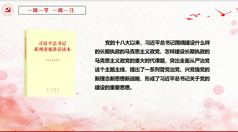 在本周的“一周一学,一周一习”活动中,学生党员们深入学习了习近平总书记关于党的建设的重要思想十三讲的部分内容,尤其聚焦了“坚持思想建党、理论强党,坚持严密党的组织体系”。