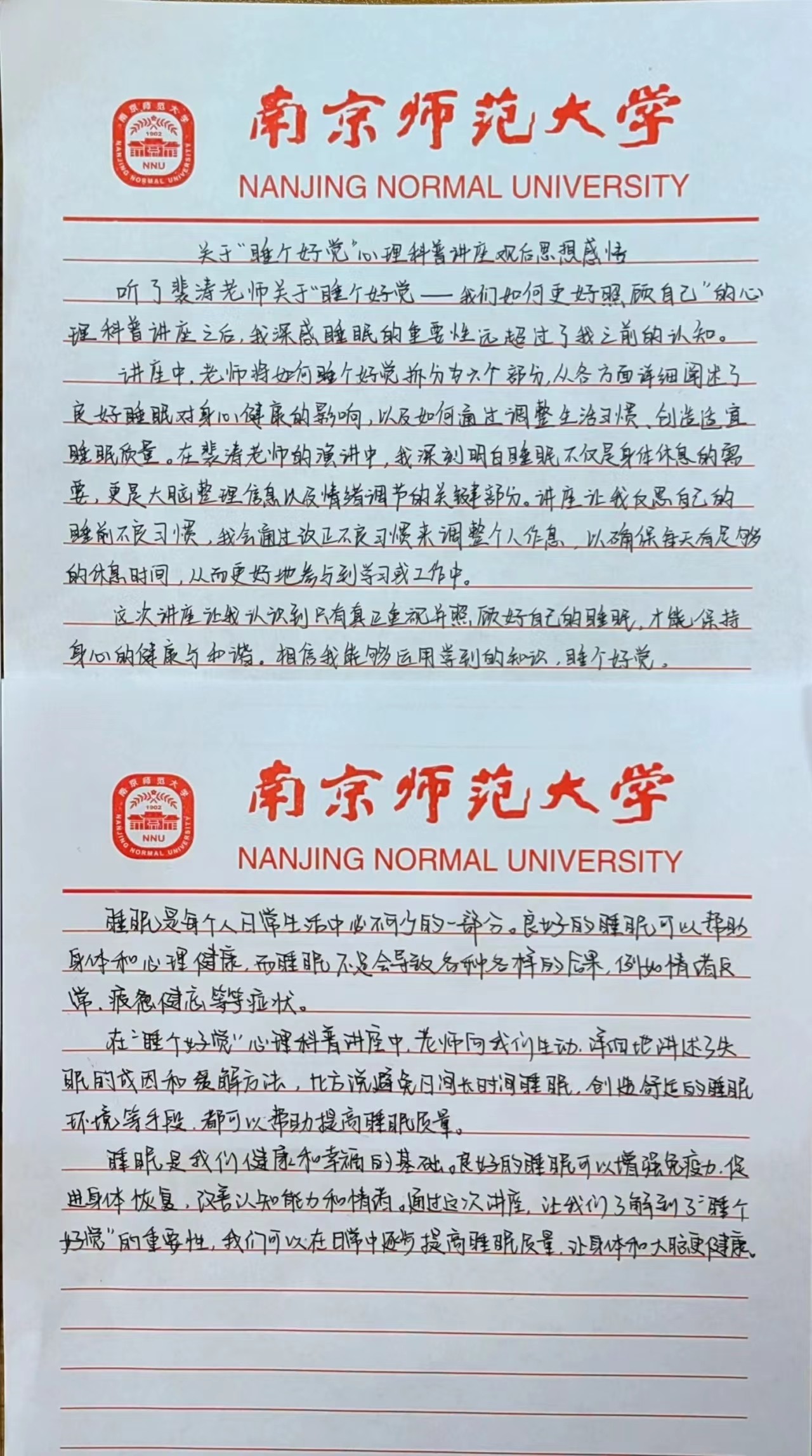 讲座的最后,裴涛教授为我们提供了睡眠卫生教育指南:规律锻炼、确保卧室的舒适度、规律进餐,不空腹上床、减少咖啡因的摄入、避免在夜间饮酒,喝过多的可乐,浓茶等,以此帮助我们更好的建立健康的睡眠系统,促进身心健康发展。在讲座结束以后,不少同学用笔写下了自己的所思所想,也希望通过此次讲座,同学们能够重视睡眠问题,采取有效措施,提升睡眠质量,拥有更加健康的生活。