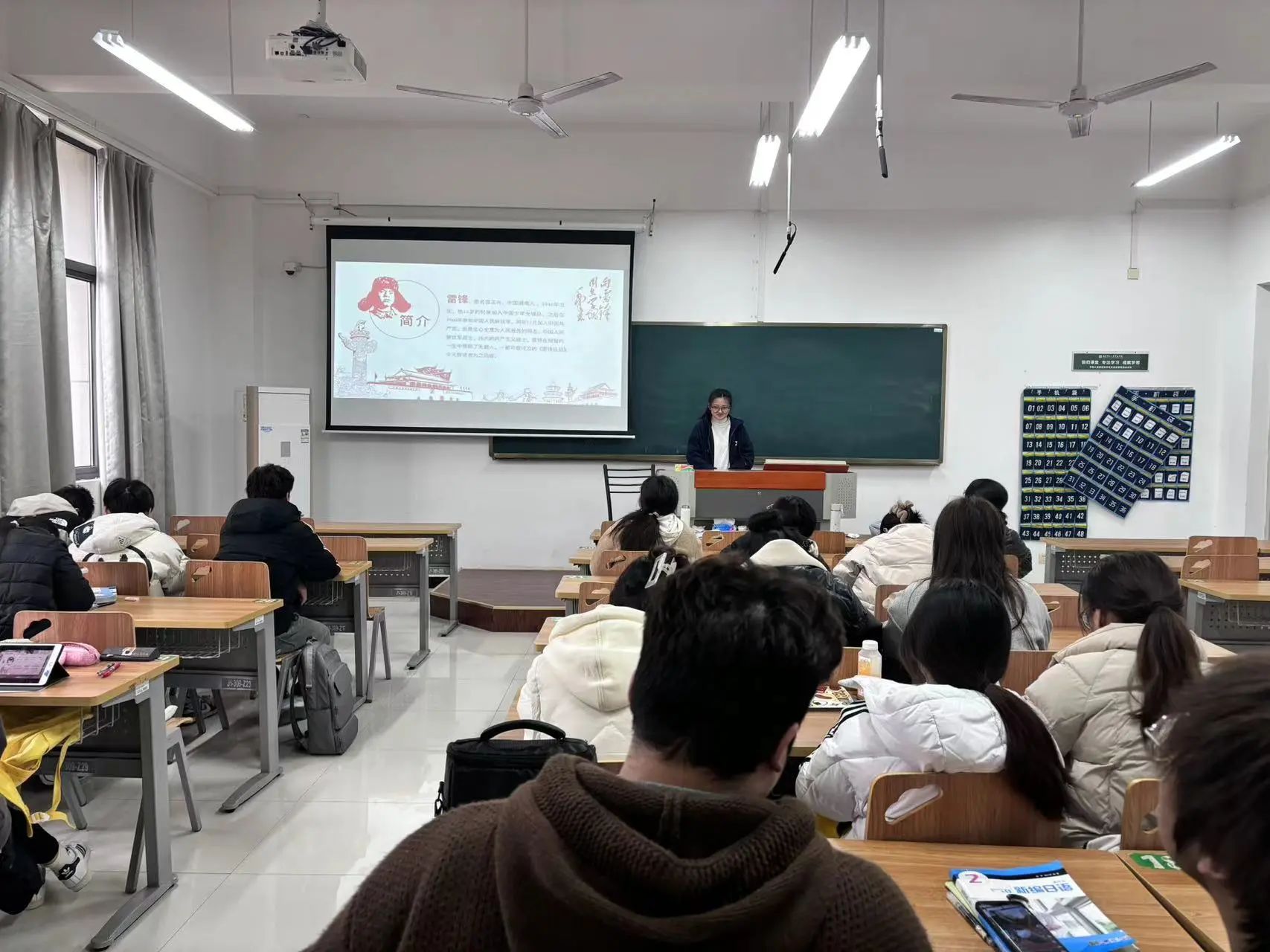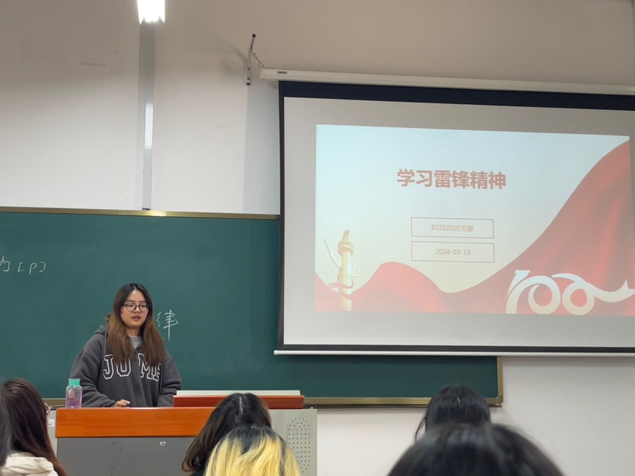 团支书以PPT的形式向同学们展示了雷锋事迹。通过学习雷锋事迹,同学们深刻感受到雷锋的奉献精神,明白了生命的意义在于奉献。