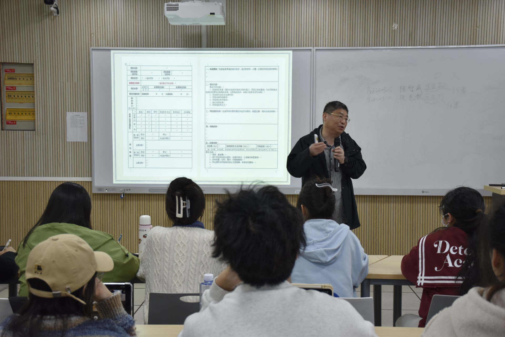 在申请书填写及注意事项中,董晓波教授以南京师范大学大创申请书样式为例进行讲解,细致入微地向师生们传授经验。他强调研究目标要明确、研究背景要详细、突出创新点,他从项目基本情况到工作安排、经费预算,逐条阐明填写的要求规范与注意事项。