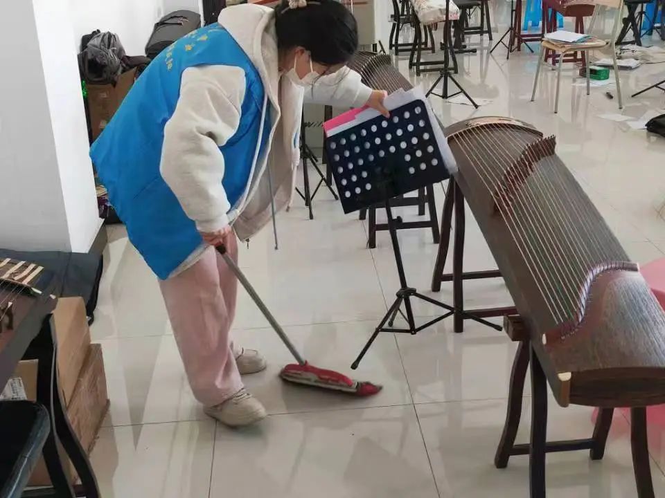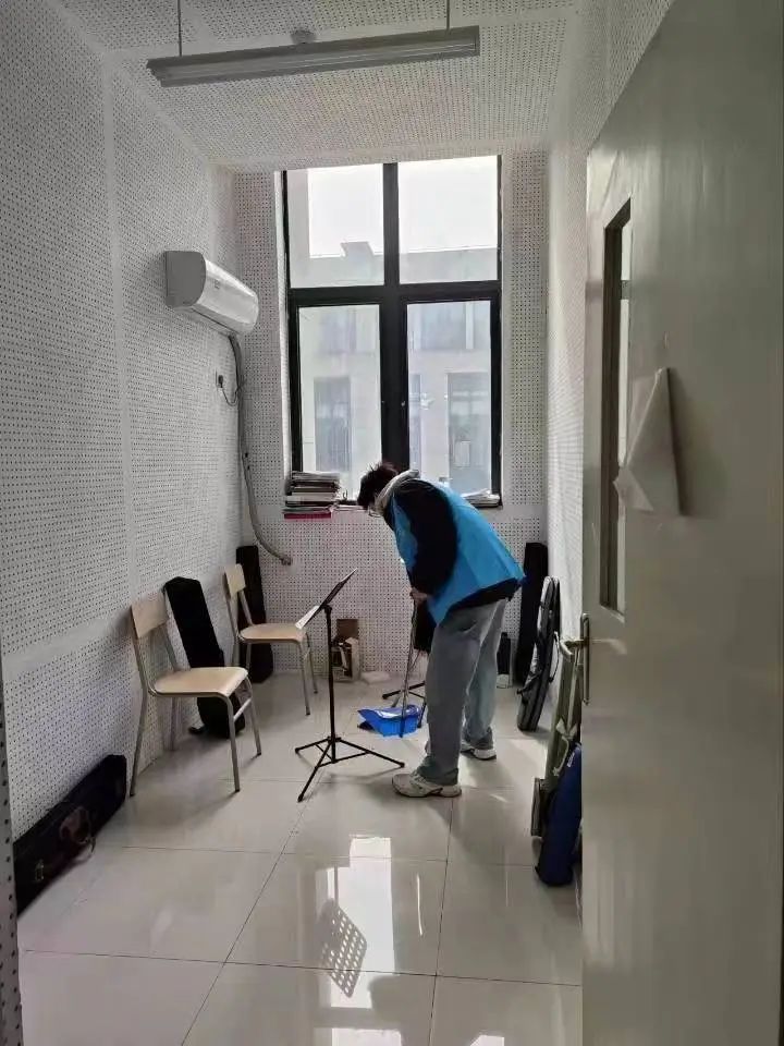 在打扫琴房方面,志愿者们带着笑容和热情开始了打扫。他们有的手持扫帚,有的手握抹布,有的肩扛清洁工具,志愿者们忙碌的身影在琴房中穿梭,犹如一幅生动的画卷。他们首先清理了地板上的灰尘和杂物,任何一个角落都不放过。地板上的污渍在他们的努力下逐渐消失,取而代之的是一片洁净如新的景象。接着将乐器摆放得整整齐齐,每一个乐器都被擦拭得闪闪发光,仿佛在向他们展示自己的美丽和价值。