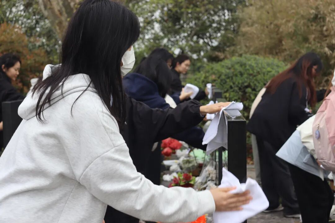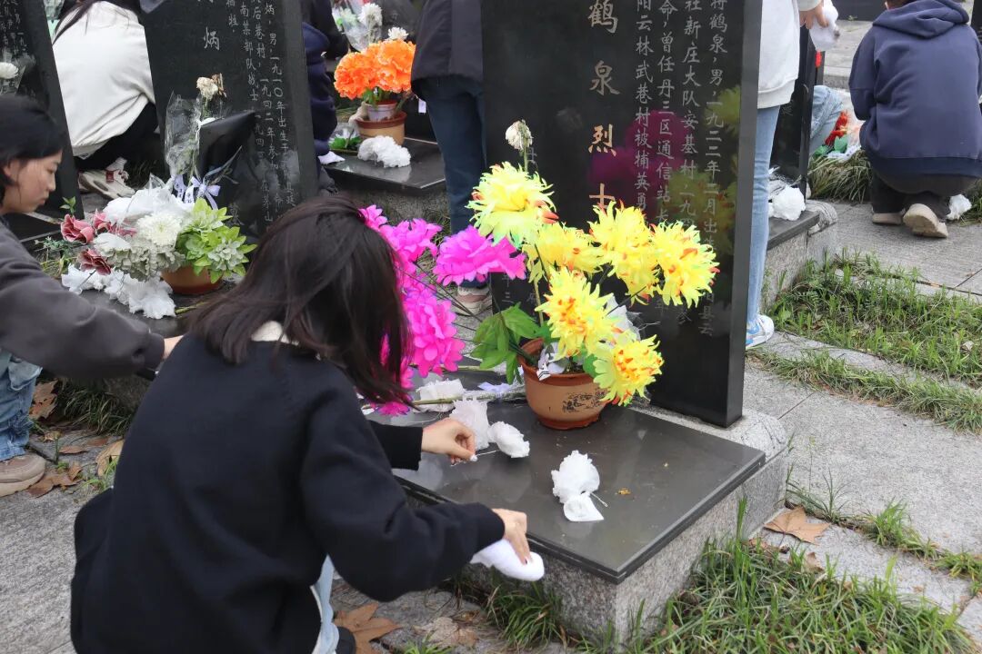 同学们怀着崇敬而庄重的心情,依次走上前,将手中精心准备的鲜花轻轻放置在烈士纪念碑前。献花仪式结束后,同学们认真细致地清扫着烈士纪念碑周围的地面。