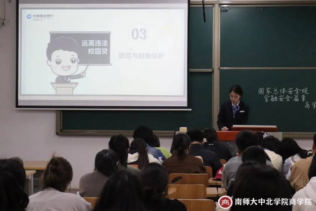 此次宣讲主要由非法校园贷危害科普以及电信网络诈骗防范两部分组成,由建行客服经理王燕、建行网点负责人殷学文来为同学们进行宣讲。