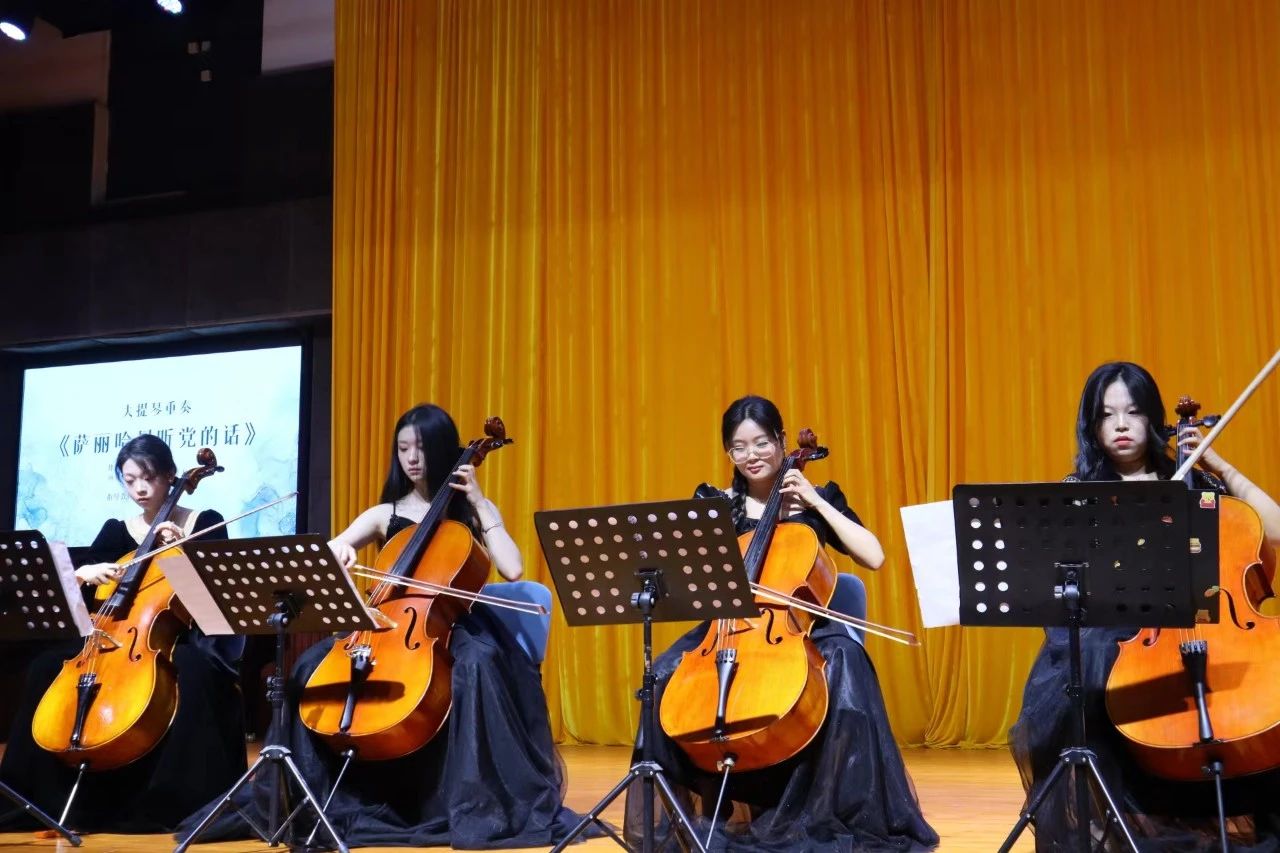 音乐会的演出精彩纷呈,令人目不暇接,转眼间就来到下半场。由王笑笑同学演奏的马林巴独奏曲《节奏舞曲》平和悦耳、干净明快,让人心情明亮,当动感节拍响起时,仿佛整个世界都沉浸在其中。大提琴重奏《萨丽哈最听党的话》演绎出那个遥远的激情年代知识青年的心声,音乐的欢快韵律洋溢着浓郁的新疆风情,纯净优美的和声体现人民对美好生活和真挚爱情的赞美之情。