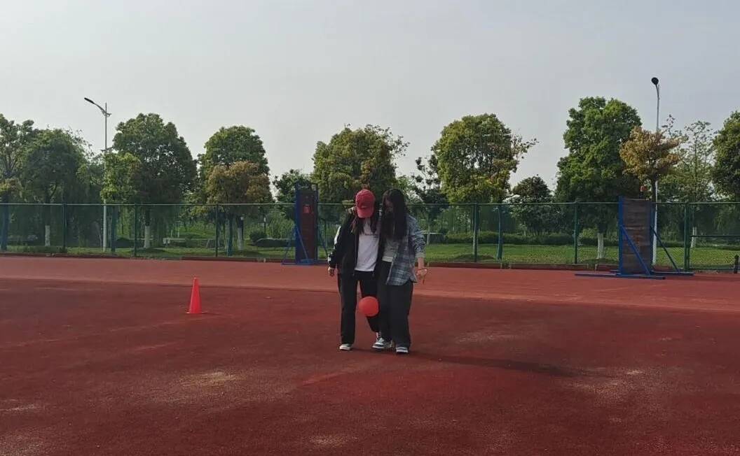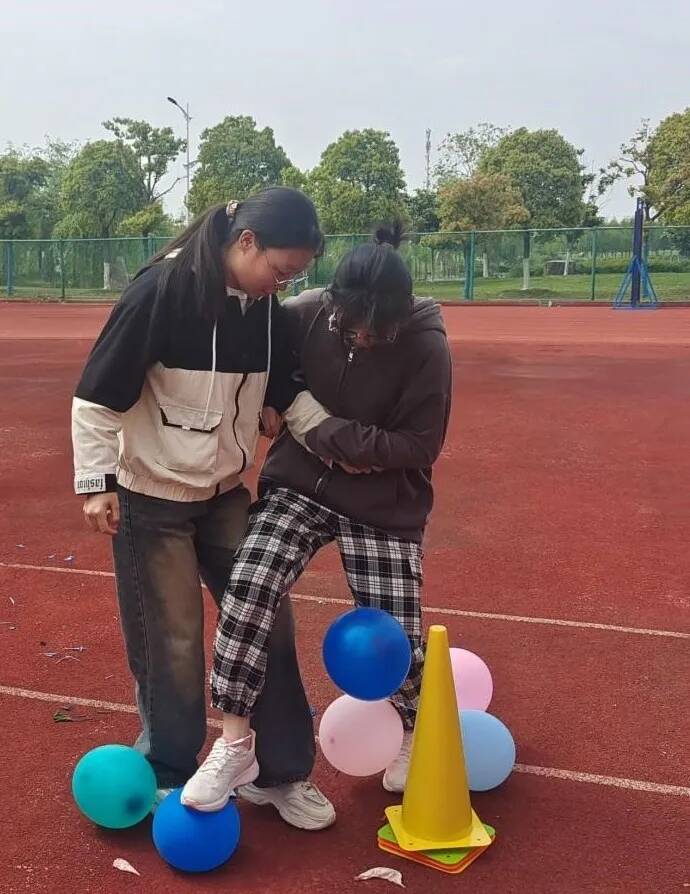 两名同学并肩站立,用小绳将两人内侧小腿绑住。将气球从场地的一端运送到场地的另一端。过程中两名同学不断调整姿势,竭尽所能的将球夹住,有的以稳取胜,有的用跳的方式。左右、左右整齐步伐的声音接连不断,欢笑声也不绝于耳,热闹非凡。