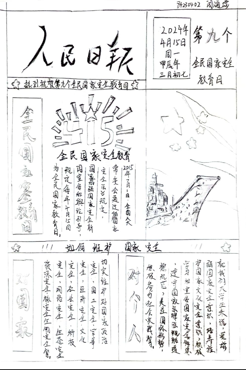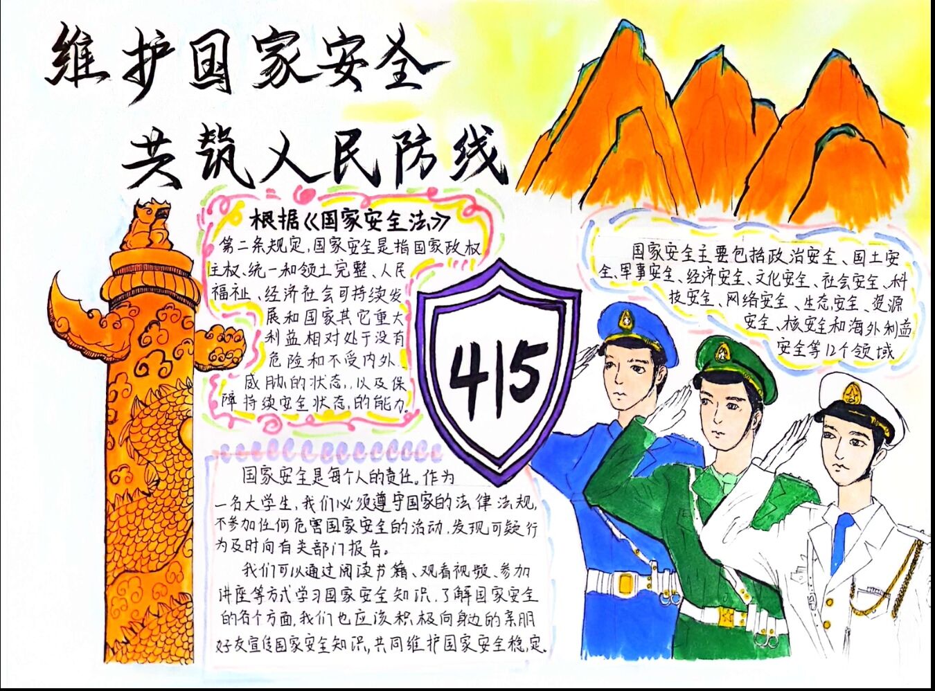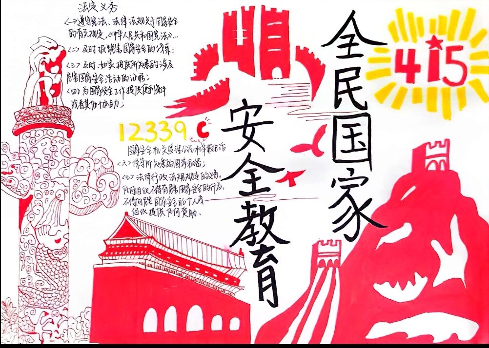 国家安全是安邦定国的重要基石,是维护人民利益的核心要义。为让学生们增强维护国家安全的意识和素养,提高社会责任感和使命感,法政学院举办了“维护国家安全,共筑人民防线”手抄报活动。