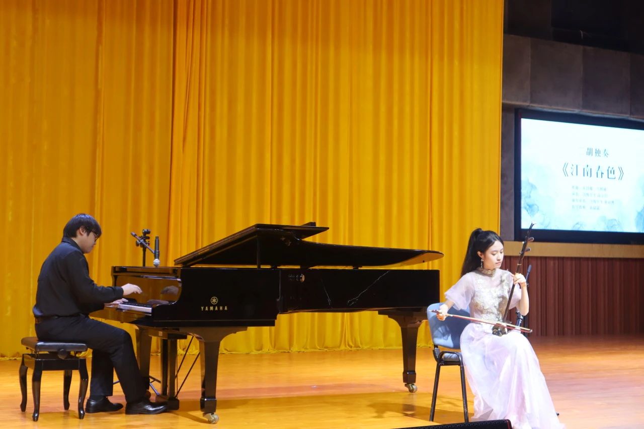 钢琴四手联弹《草原小姐妹》具有较为鲜明的蒙古族歌舞特点,鲜明的节奏感和明朗欢快的旋律为观众们描摹了在辽阔草原上,一对小姐妹在放牧中遇见了暴风雪,不畏艰险勇敢保护羊群上的生动画卷,使人们能够在音乐中感受到生命的力量和美好的色彩。“千里莺啼绿映红,水村山郭酒旗风。”一首二胡独奏《江南春色》运用流水般自由舒展的音乐旋律和晶莹的自然泛音,一下子把人们带到了优美如画的江南水乡,静谧而陶醉。
