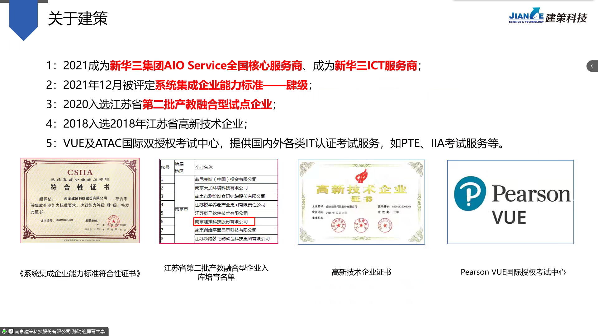 南京建策科技股份有限公司于2004年成立,建立了完整的建策职业教育体系,致力于搭建为高校、学生、企业提供一站式解决方案的综合性服务平台,与国内各高校共同招生联合培养,为IT企业定向输送合格的专业人才,是Cisco、H3C、Redhat、Oracle、华为授权合作伙伴。建策与国内200多家高校建立了人才联盟平台,同时为平台引进了国内千家IT企业,定向、定点、精准的进行人才输送。