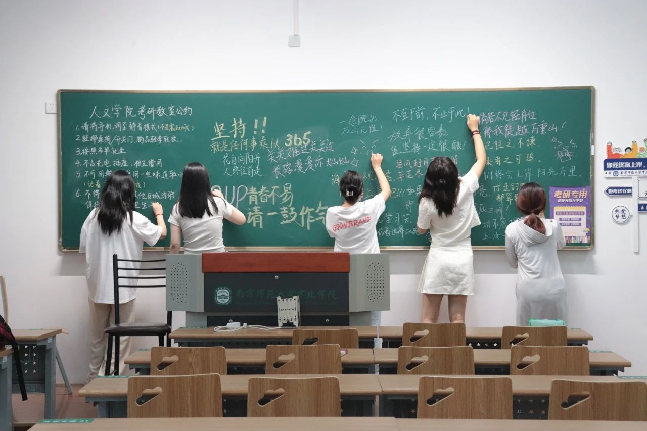 此外,志愿者们还在黑板上留下了考研励志语录和自习室公约,帮助考研学子们戒躁戒躁,保持清醒,同时也激励他们奋发图强,以更昂扬的斗志投入复习当中,一战成硕。最终在志愿者们的努力下,教室干净整洁,氛围积极向上。同学们用实际行动为我院考研学子送上最诚挚的祝福。此次志愿者活动的开展,增强了同学们的责任感和使命感,用自己的行动表达了对考研学子的支持和关心,营造出互帮互助的良好学习氛围。同时也强调了人文学院“我为同学做实事”的初衷,以实际行动鼓舞考研学子全力以赴奔向美好前程,并衷心祝愿他们成功上岸金榜题名。