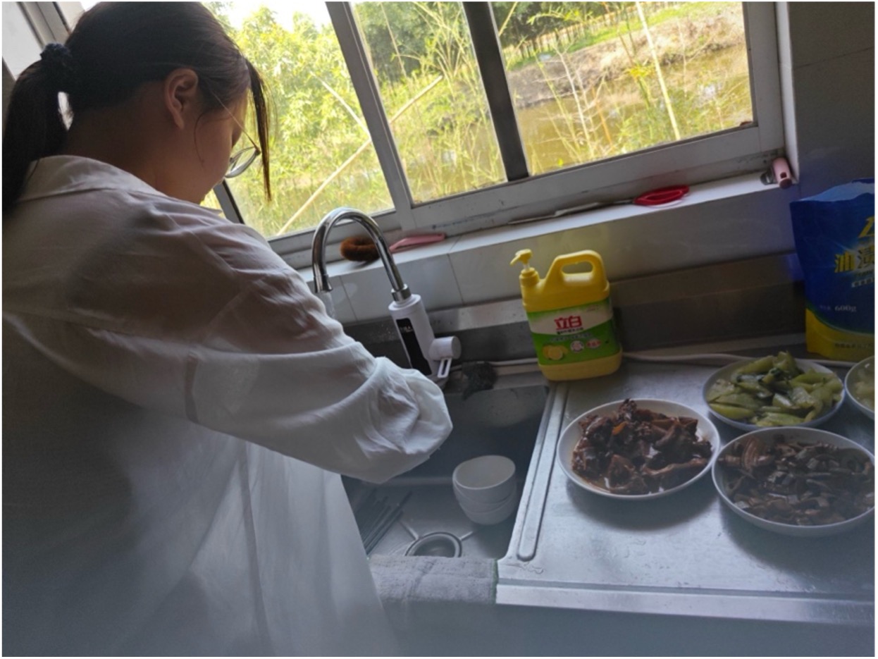 午饭后,志愿者们在公益基地的厨房中洗涤餐具、打扫卫生。
