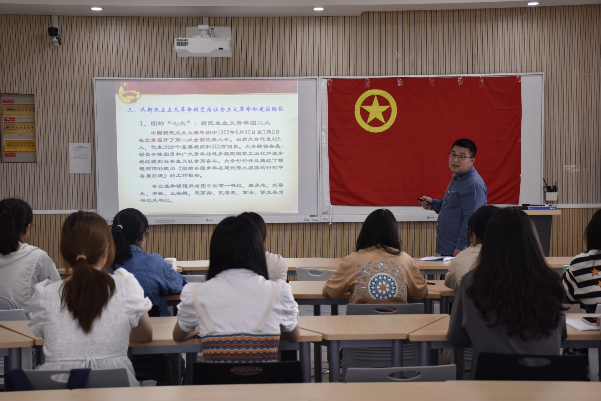 习近平总书记寄语青年:“青年兴则国家兴,中国发展要靠广大青年挺膺担当。”为贯彻落实习近平总书记的指示,深入推进团员和青年主题教育,提高团员思想理论水平和政治素质,2024年5月14日下午4:50,外国语学院于崇文楼449教室开展“忆百年团史,追未来华章”主题团课。团课围绕共青团的光辉历史、共青团的发展历程和共青团员的权利和义务展开,团课由外国语学院王文山老师主讲。