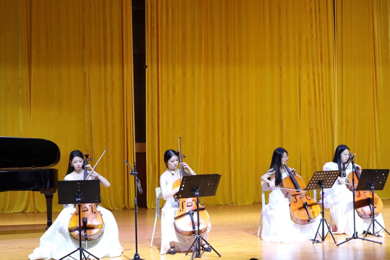 紧接着,林杉、丁梓弦、吕枢遥和李思琦四位同学精彩绝伦地演绎了大提琴重奏《Perfect》,那流畅的音符恰似丝滑的绸缎般舒展,悄然传递出英伦音乐的浪漫韵味,而他们演奏的祝恒谦曲的《萨丽哈最听党的话》,更是展现出别样的风情与强大的力量。