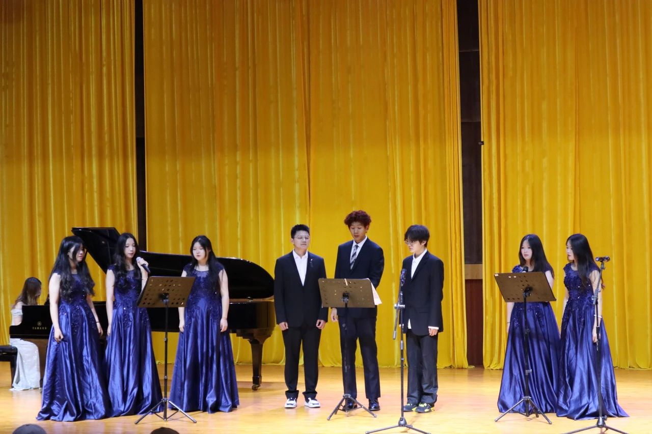 张雅绮、时间、杨云、刘雨涵、井雯博、张恒毓、卓南君、李家乐、陈祎婧和魏逸钒几位同学齐心协力为观众呈上了《The Swing 摇摆》《Arirang 阿里郎》《玫瑰三愿》《踏雪寻梅》等诸多精彩曲目。他们的演唱或似热情的火焰熊熊燃烧,或如温婉的溪流潺潺流淌,亦或像深沉的海洋内敛雄浑。在南京美同学的钢琴伴奏下,每一个音符仿佛都被赋予了灵动的生命,或摇曳生姿地舞动,或悠扬婉转地飘荡,或深情款款地倾诉,引领听众沉浸于音乐的浩瀚海洋中,尽情感受着旋律那无尽的魅力与强大的力量。