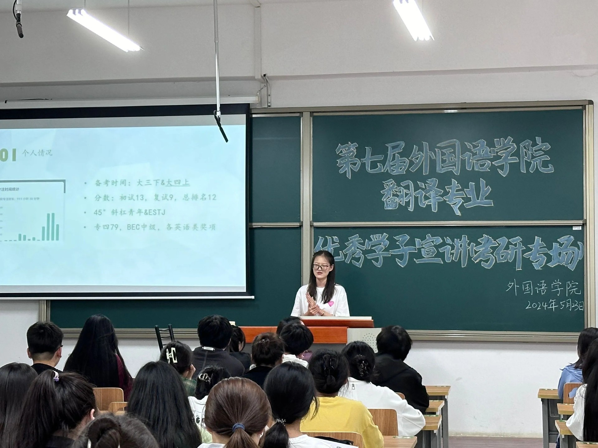 星光不负赶路人,时光不负有心人。2024年考研落下帷幕,我院学子也取得了优异成绩。为进一步帮助同学们明确考研方向,熟悉备考流程,5月23日下午18:00,外国语学院在敏行楼208教室开展第七届外国语学院翻译专业优秀学子宣讲会(考研专场),此次宣讲会邀请了2020级翻译专业丁可、张曼歆、刘冰卓主讲。
