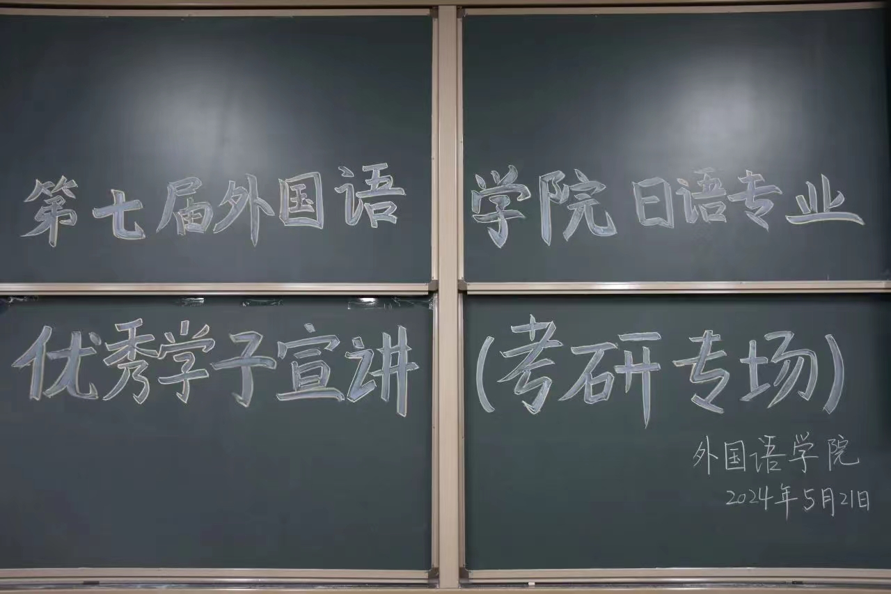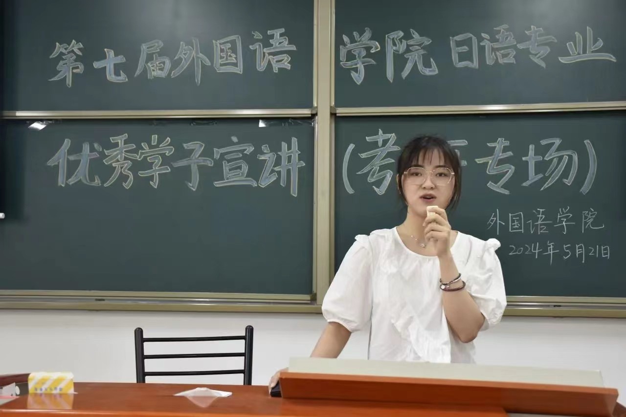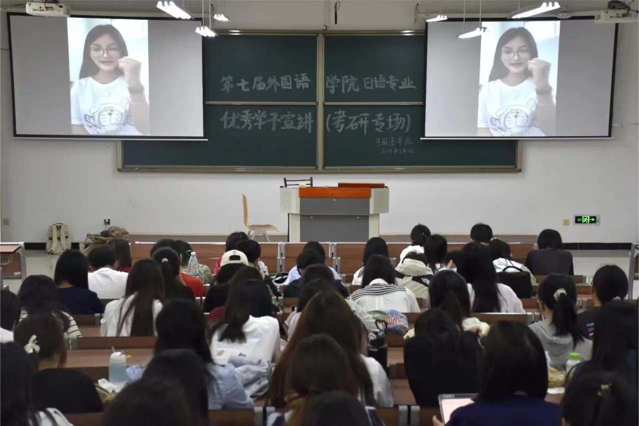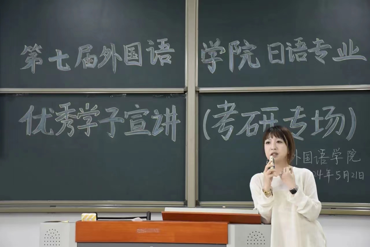 追风赶月莫停留,平芜尽处是春山,2024年考研在夏日蝉鸣中落下帷幕。为进一步加强学院学风建设,营造良好的考研学习氛围,帮助同学们明确考研目标、制定考研规划、掌握学习技巧,5月21日起,外国语学院开展“一‘研’为定,逐梦飞扬”优秀学子考研宣讲系列活动。21日上午10:00,日语专业优秀学子宣讲会于敏学楼119教室开展,本场宣讲会邀请了20级日语专业刘梦颖、李文迪、任思轩主讲,日语专业21级、22级全体学生参加,活动由外国语学院日语与法语系主任张莉主持。