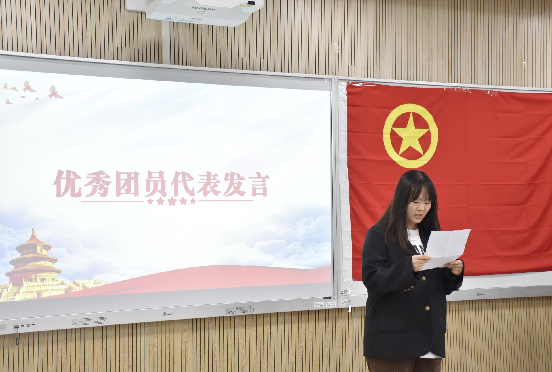 822203班唐艺菲作为优秀团员代表发言。唐艺菲表达了自己在共青团中所学所得,其中提到她在工作期间学到了什么是青春的意义以及如何在有限的时间里成为更好的自己,并为新发展团员们表达了自己的祝福。