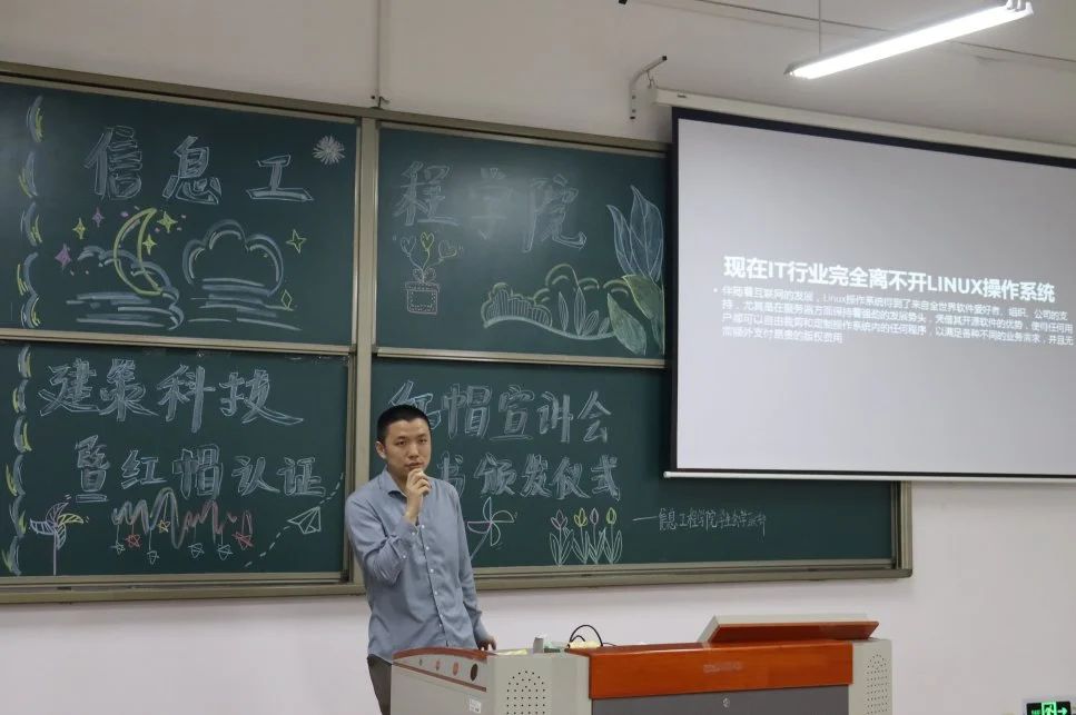 接着,建策科技的石老师就红帽技术的发展历程、行业价值、培训内容及就业前景多方面进行了深入剖析,强调了红帽工程师认证在同学们的职业生涯中的重要性和价值。信息工程学院的学生们积极参与,踊跃提问,现场气氛热烈。