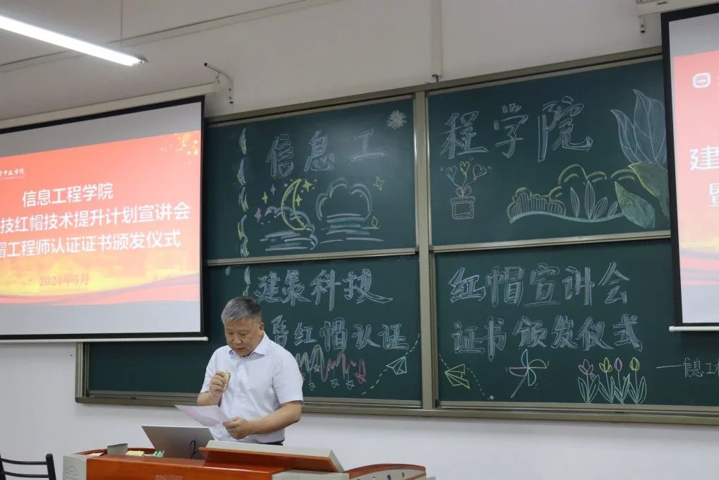 为进一步提升我院学生在计算机操作系统领域的职业技能,促进学生在信息技术领域的深入学习和实践,信息工程学院与建策科技有限公司于6月5号在一教119联合举办红帽技术提升计划宣讲会暨红帽工程师认证证书颁发仪式。本次活动的出席老师有信息工程学院院长曲维光、党总支副书记祁祺、辅导员杨艳、建策科技有限公司陈美燕老师和石文晗老师。活动由学职部主要负责人邱棕炜主持。