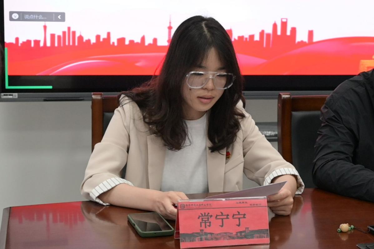 ▲组织委员常宁宁介绍申请人的主要情况并报告对五位申请人的政治审查情况。