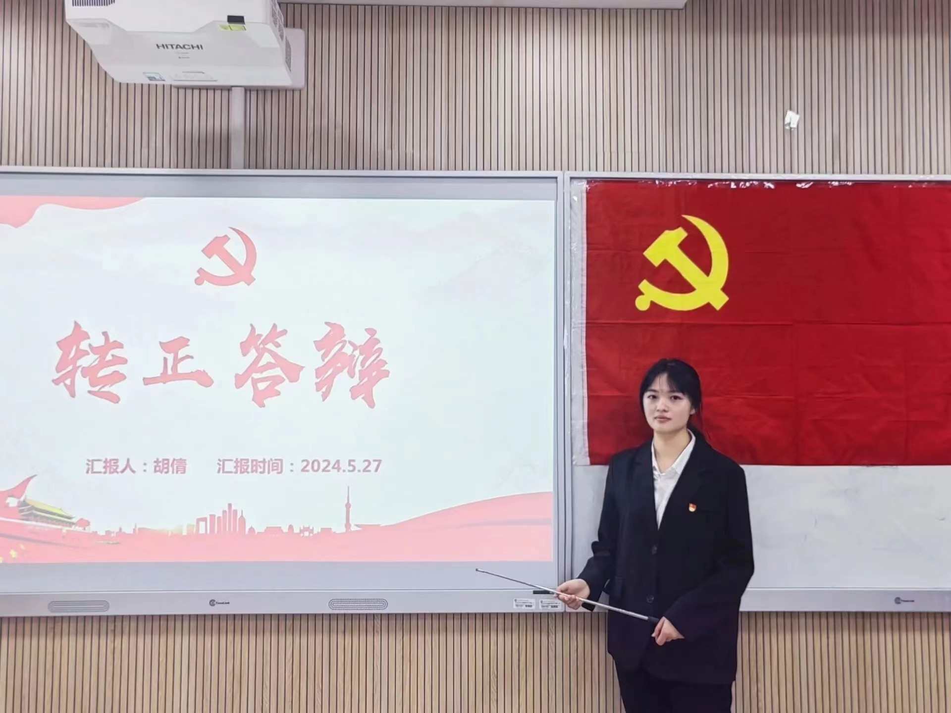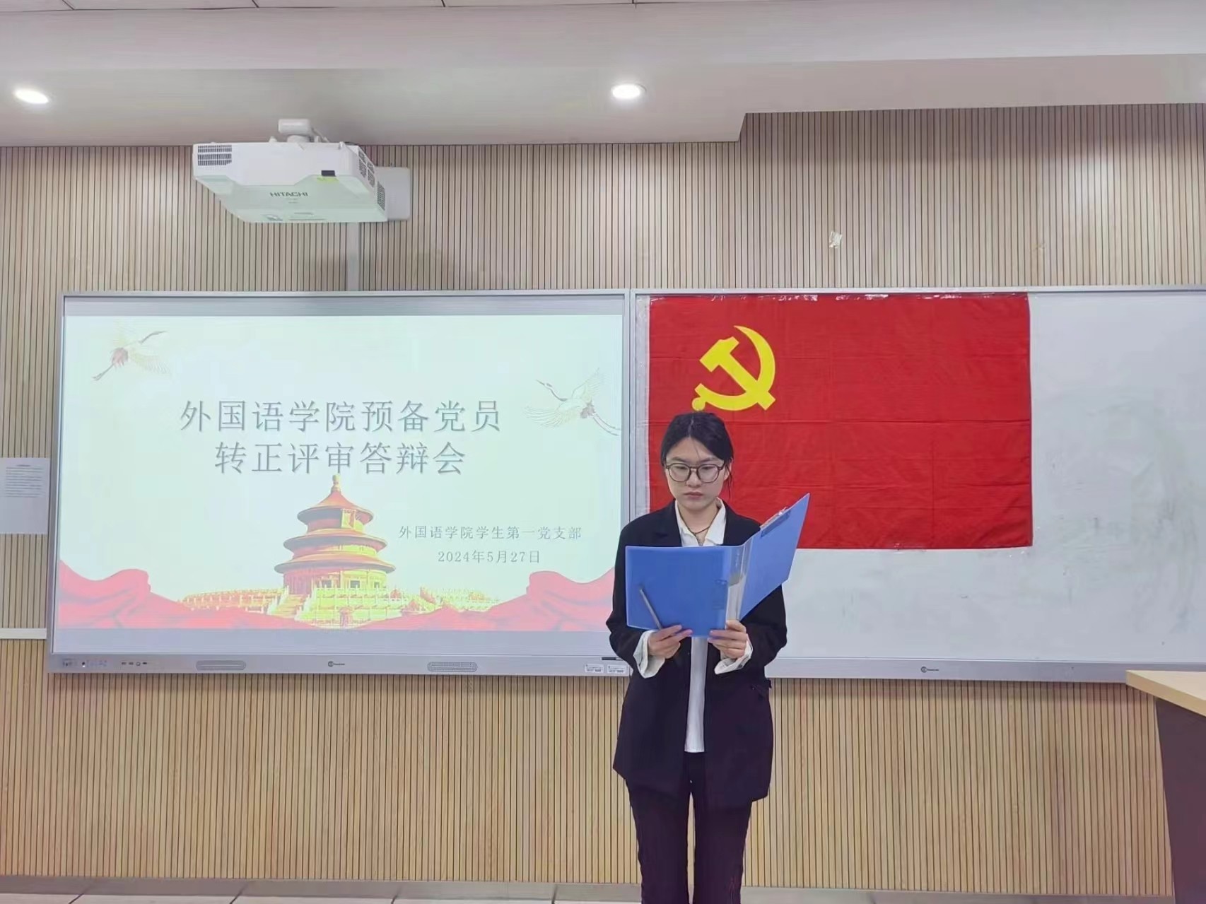 2024年5月27日上午9:00,外国语学院学生第一党支部于崇文楼449教室举行预备党员转正评审答辩会。外国语学院学生第一党支部书记朱雨炜老师、副书记赵峥嵘老师出席本次会议。答辩分为个人陈述和问题回答两个环节。施红利、胡倩、刘冰卓、熊嘉琳等14名预备党员参加本次答辩会。本次会议由张艺钦同学主持。
