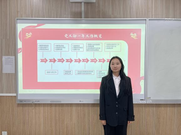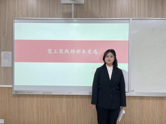会议伊始,林露露、戴浩然、顾韵琴、王欣雨、刘诗雨、董璐瑶、王亦柔七位候选人依次上台进行竞选演讲。她们分别从任职经历、对部门的认识、部门未来一年的工作计划等方面进行了详细地阐述,充分展示了自己的能力和潜力。每一个字,每一句话都饱含对党工部工作的热情与信心,展现出她们的责任和担当。