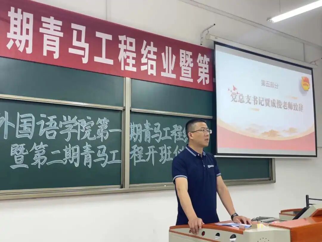授旗交接仪式结束后,外国语学院党总支书记贾成俊老师致辞。贾成俊书记首先对第一期“青马工程”培训班所取得的育人成效,对学生骨干在全院青年中所起到的引领作用给予肯定。他提出,第一期“青马工程”内容丰富,形式多样,实践和理论相结合,有助于提升学生干部的工作能力和水平。同时,贾成俊书记也对第二期“青马工程”提出了希望和要求。他指出,课程安排要遵循人才培养规律,用马克思主义中国化道路培育青年,增强社会责任感。