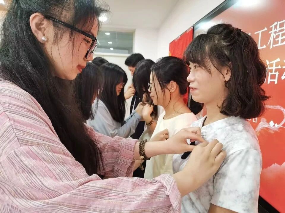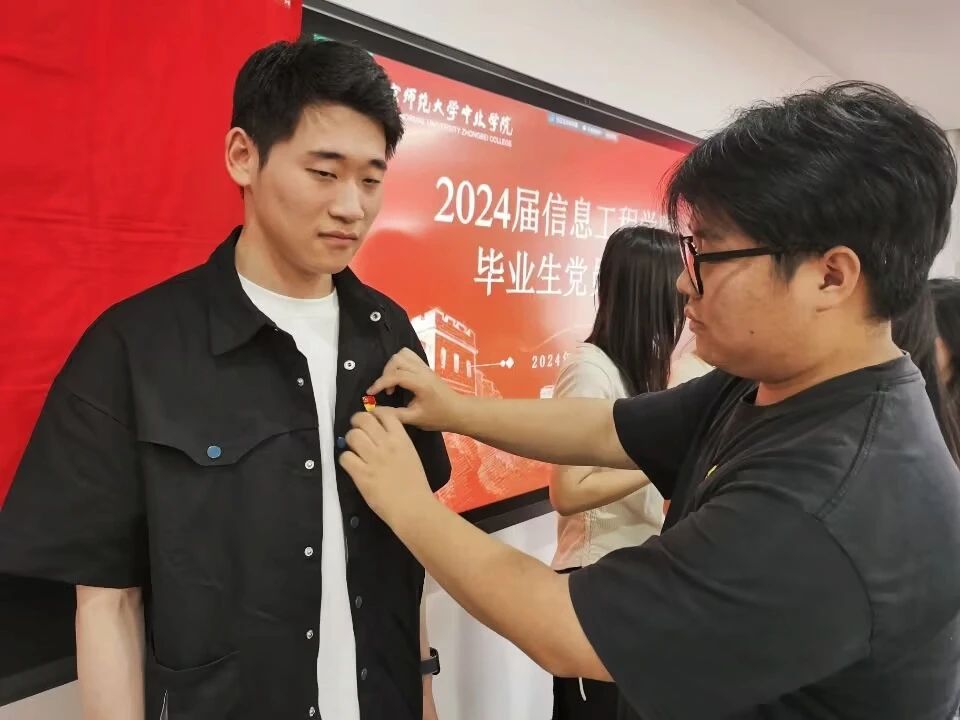 最后,每位新接收的预备党员在毕业生党员的指导下,认真地领取并佩戴党徽,这一过程不仅象征着新加入的党员对党的忠诚以及为共产主义事业奋斗终身的决心,同时也是一种传递,体现了毕业生党员将党的优良传统和宝贵经验传递给新党员的责任与使命,毕业生党员在这一过程中扮演着重要的角色。佩戴党徽不仅是一个形式上的仪式,更是对党员身份的一种自我提醒和自我激励,促使学生党员们在日常生活中不断自我提升,以实际行动践行党的宗旨。