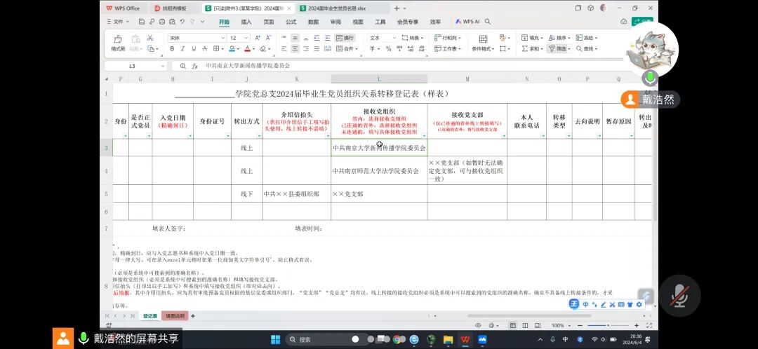 会上,戴浩然就《关于做好2024届毕业生党员组织关系转移工作的通知》进行详细解读,向毕业生党员详细讲解了党员组织关系转移类型、办理程序及注意事项。同时提醒毕业生党员们及时联系所在工作单位的党组织或乡镇党组织,确保转接信息的准确性、及时性。她强调,党员关系和组织身份是党员的另一个“身份证”,党员组织关系转接是党员管理的一项重要工作,对毕业生党员今后工作、学习和生活有着重要的影响,全体党员同志要高度重视党组织关系转接工作,妥善落实好毕业后的个人组织关系去向。
