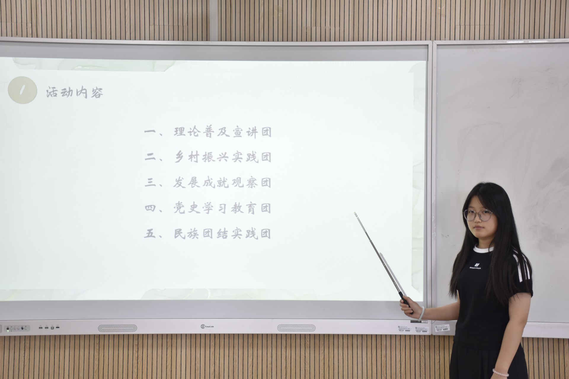 首先,邹佳琪向各生活委员介绍了实践活动的内容,主要包括理论普及宣讲团、乡村振兴实践团、发展成就观察团、党史学习教育团、民族团结实践团等五个类别,有序且详细地介绍了相关类别的具体内容,简要介绍了各类别所对应的内涵。让各生活委员有效地了解社会实践活动具体内容,使其能够有效开展活动的宣传工作。