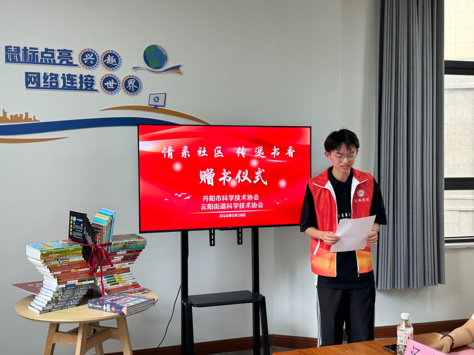 实践部干事刘益辰作为学生志愿者代表进行发言,表达对书苑揭牌的祝贺,并代表志愿者承诺今后将竭尽全力,为书屋的各项活动提供支持,帮助营造社区全民阅读的良好氛围。