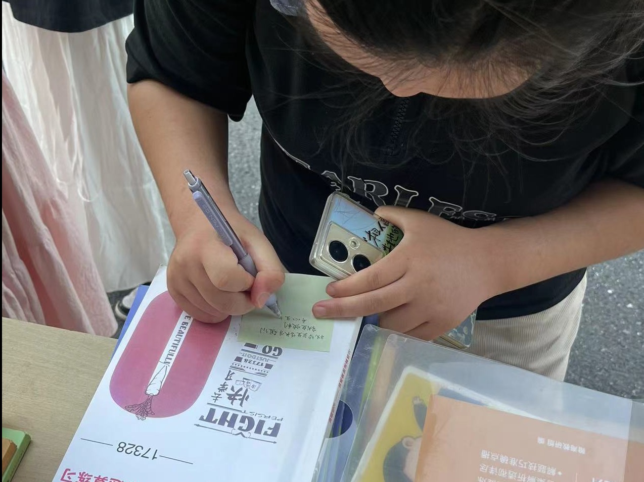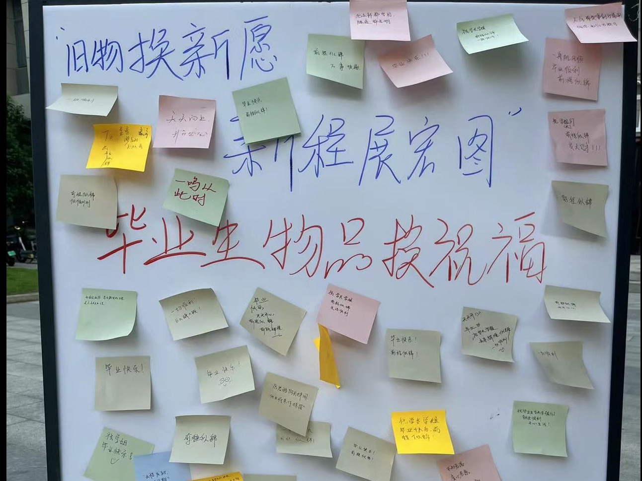 在书写祝福的同时,同学们还根据各自的需求和兴趣,精心挑选了书籍资料和其他物品,以期望在学术和生活中获得更多的收获与成长。最终,同学们将写满祝福的便利贴逐一粘贴在留言板上,为即将离校的学长学姐们送上了一份真挚而热切的祝愿。
