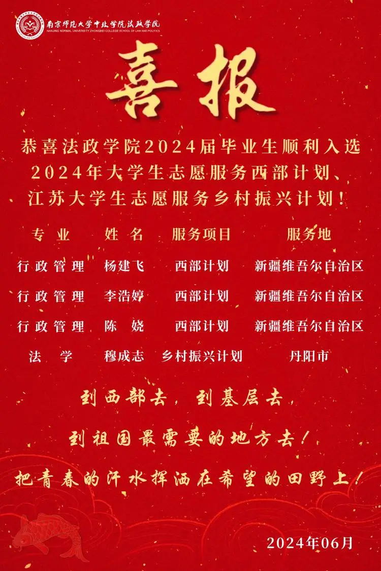 法政学院 | 2024届毕业生顺利入选2024年大学生志愿服务西部计划、江苏大学生志愿服务乡村振兴计划