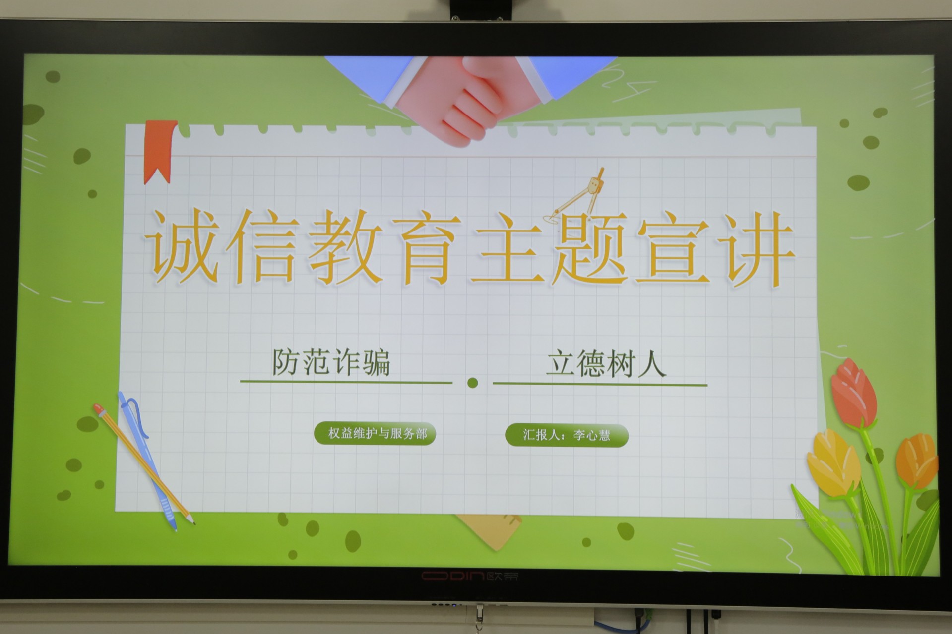 为普及诚信教育,预防校园诈骗,警示同学们远离不良校园贷,切实增强大学生的诚信意识和金融安全防范意识,增强法律意识和契约精神,法政学院权益维护与服务部于6月18日16时30分在崇文楼111室举办诚信教育主题宣讲暨知识竞赛活动。