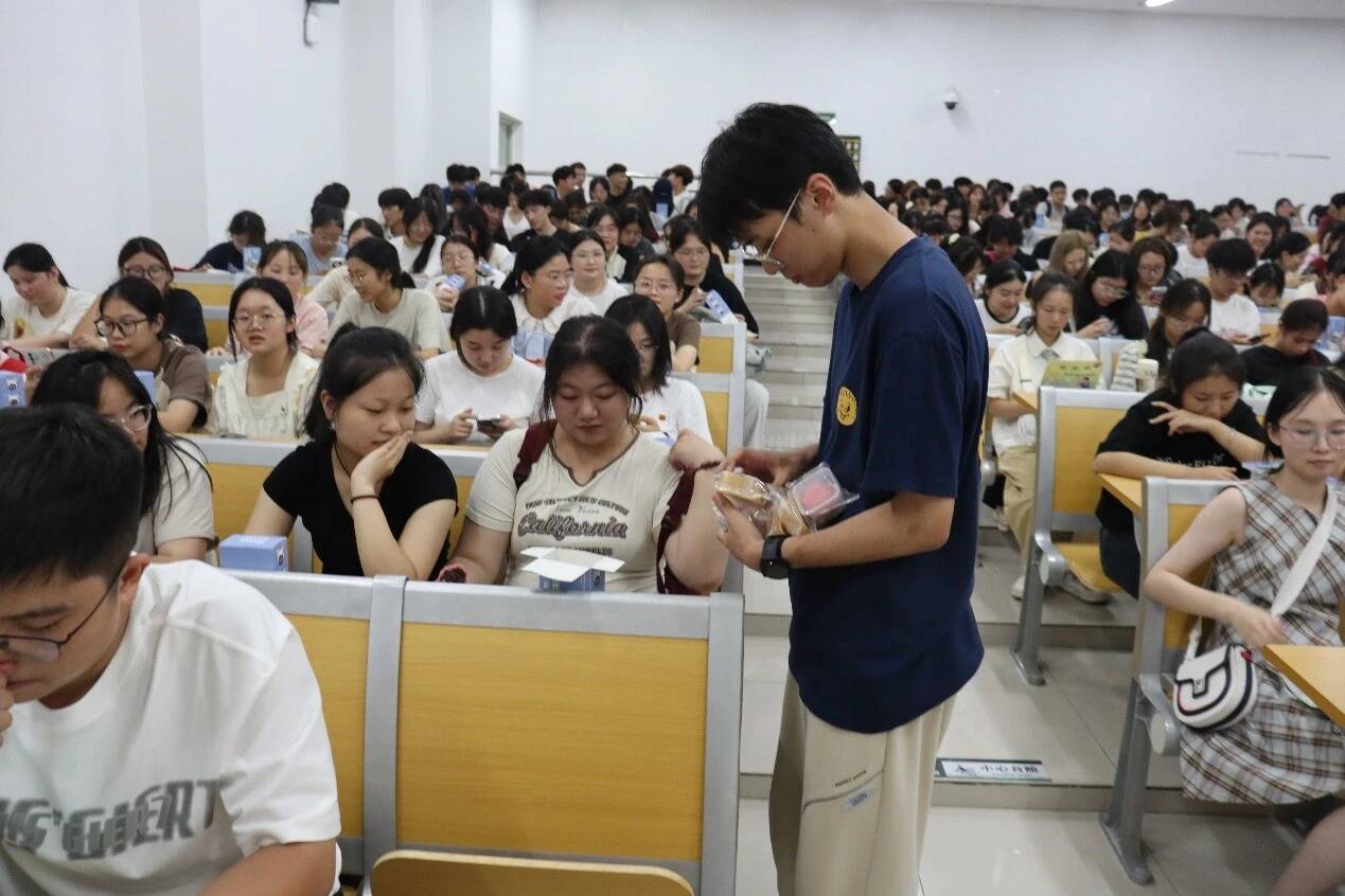 班会逐渐接近尾声,为了庆祝即将到来的中秋佳节并表达对新生们的节日祝福与关怀之情,学院特意为每位新生准备了美味的月饼。当这份心意满满的礼物被逐一分发到同学们手中时整个教室洋溢着幸福与喜悦的气息。这份小小的月饼不仅承载着学院对新生们的节日祝福与美好祝愿更寓意着商学院与同学们之间深厚的情感纽带与共同成长的未来愿景。