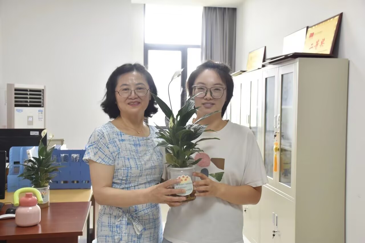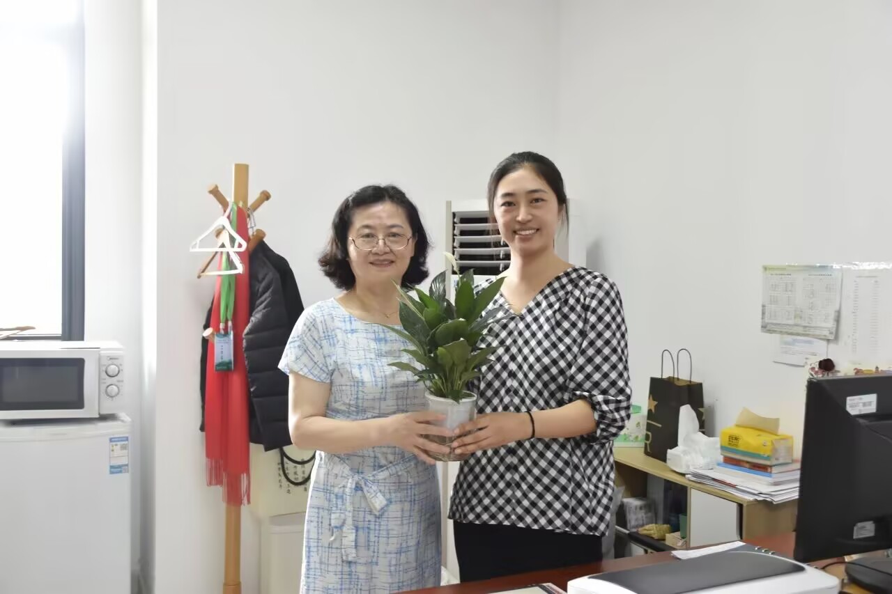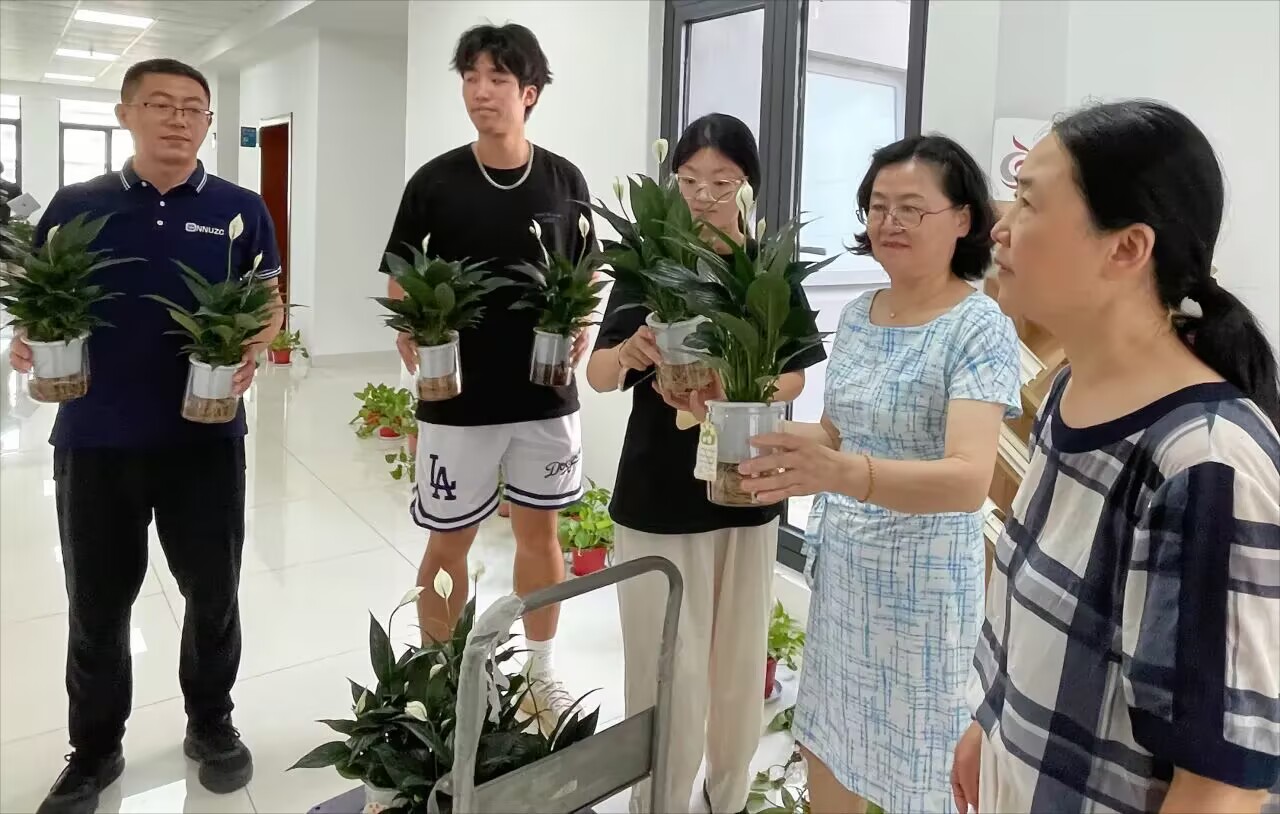 外国语学院王文琴院长、贾成俊书记带领着学生代表手捧精致的盆栽慰问全体教职员工,体现了学院对教师的关心、爱护,也体现了我院学子对老师们的尊敬、爱戴以及真挚的祝福。在此前夕,外院学子准备了各式各样的便利贴,满心欢喜、精心准备着对老师们的祝福;并将盆栽进行分装,擦洗瓶身、细心浇灌,宛如他们的恩师给予的爱的浇灌。