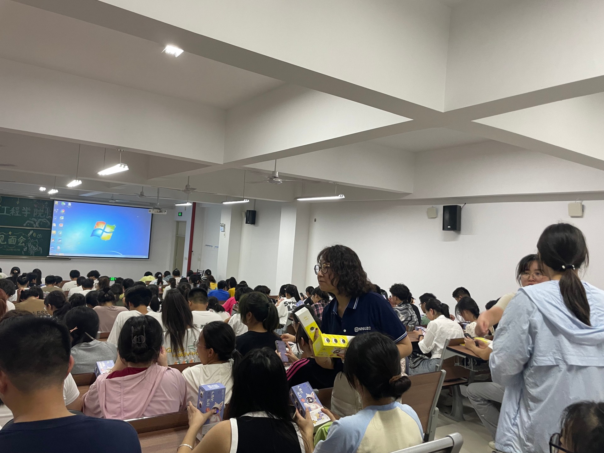 在班会的尾声,老师们为新生们准备了一份特殊的惊喜——月饼,以及表达对同学们中秋佳节的祝福和关怀。老师们逐一走到每位新生面前,将这份甜蜜的祝福亲手送到他们手中。月饼不仅代表了团圆和美满,更承载着老师们对新生们未来学习生活的美好祝愿。