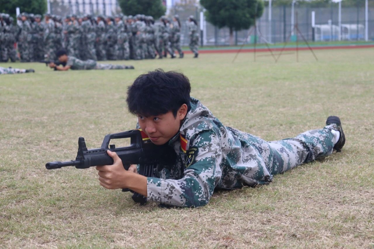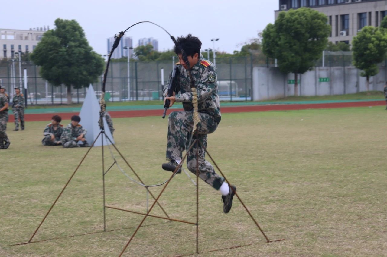 军体拳方阵的同学们动作整齐划一,在一声声“杀”中爆发出激情;行进式方阵的同学们整齐的踏步、正步、跑步,每一步都昂首挺胸,可谓是英姿飒爽;战术演练方阵的同学们匍匐前进,穿梭于低矮的障碍物间,他们的目光如炬,认真而专注地凝视着前方。